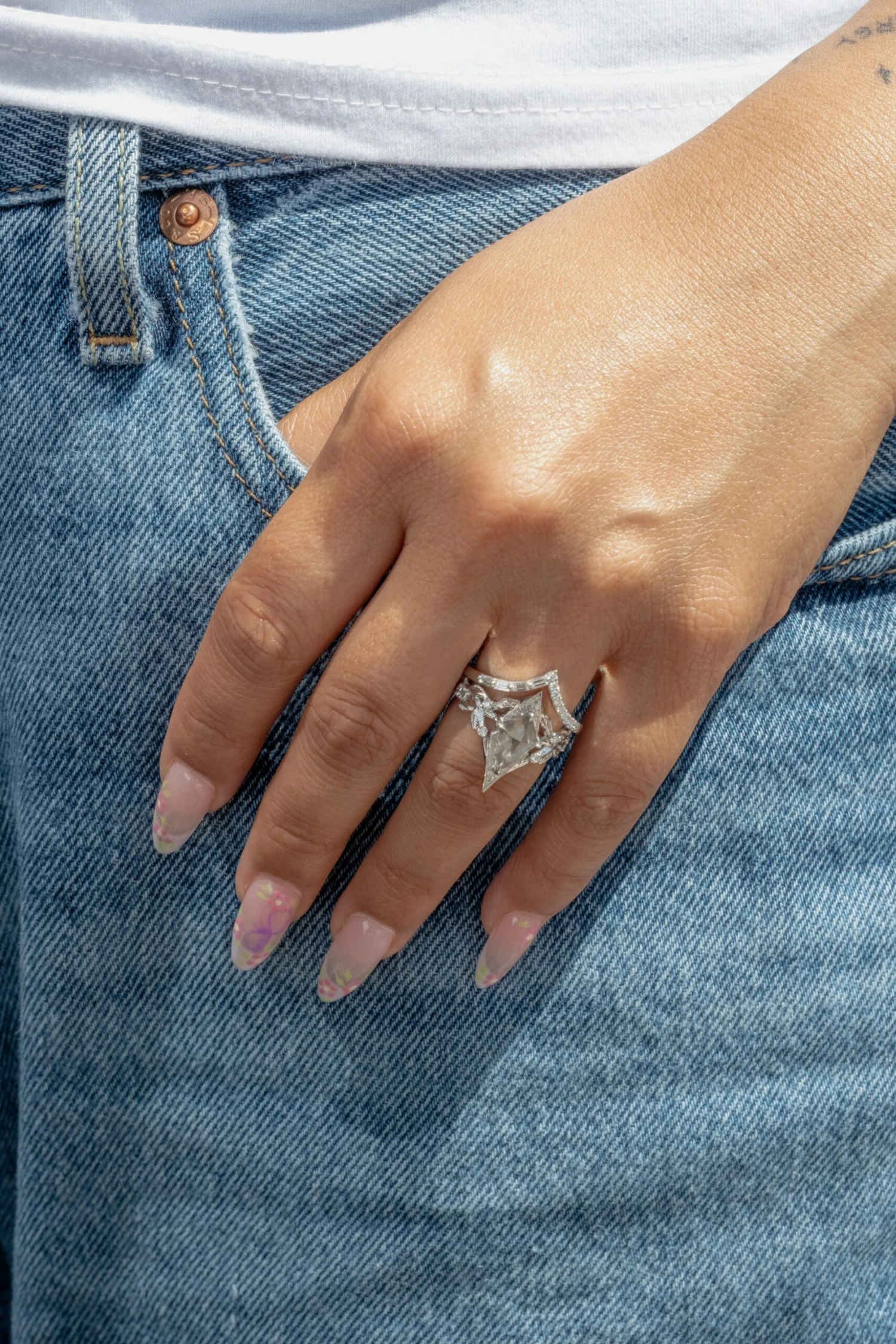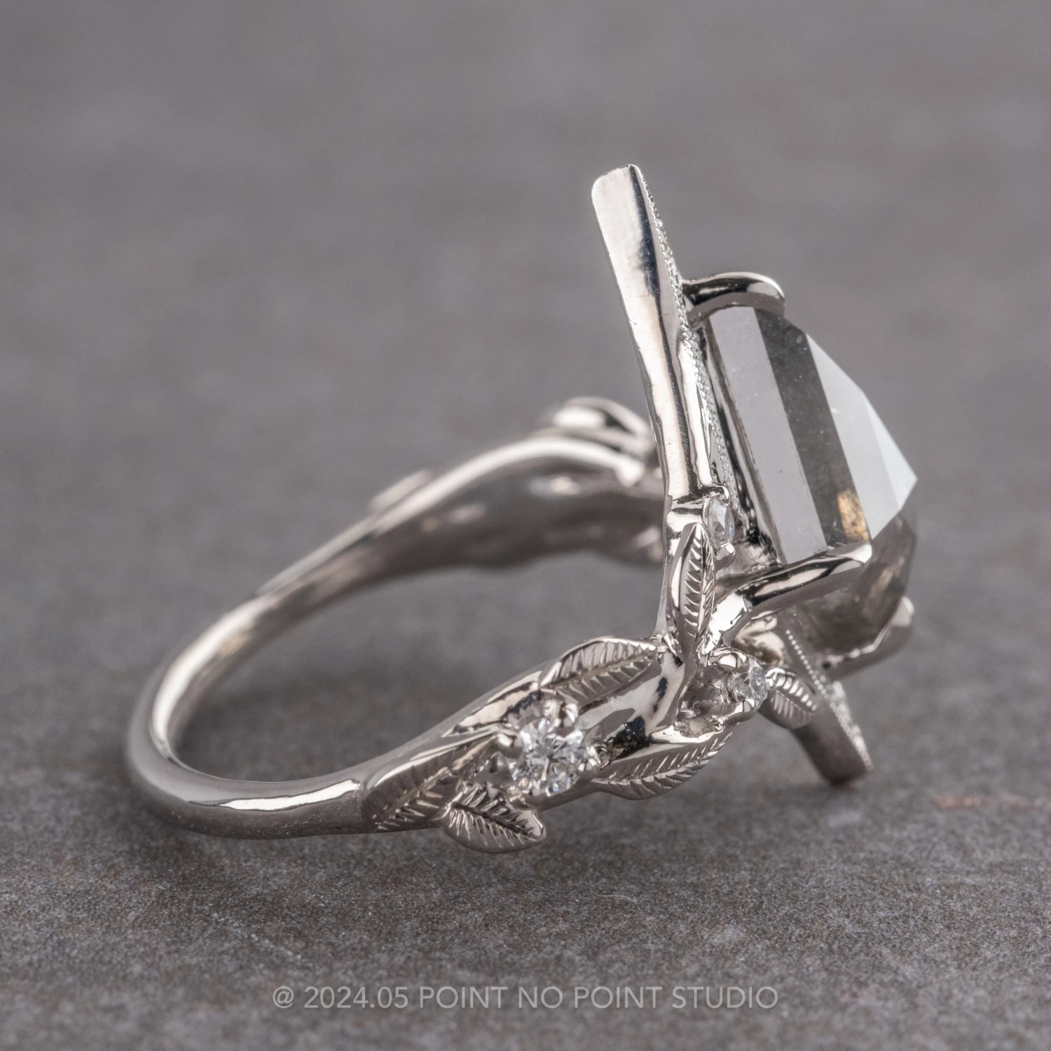 This captivating salt and pepper kite diamond engagement ring is a stunner! The ring features a 2.71 carat grey salt and pepper rose cut kite shaped diamond. The diamond is a top quality natural stone, it is semi-translucent with unique tones and facets that catch the light. The kite is set into an open back setting to allow light to illuminate through the diamond.