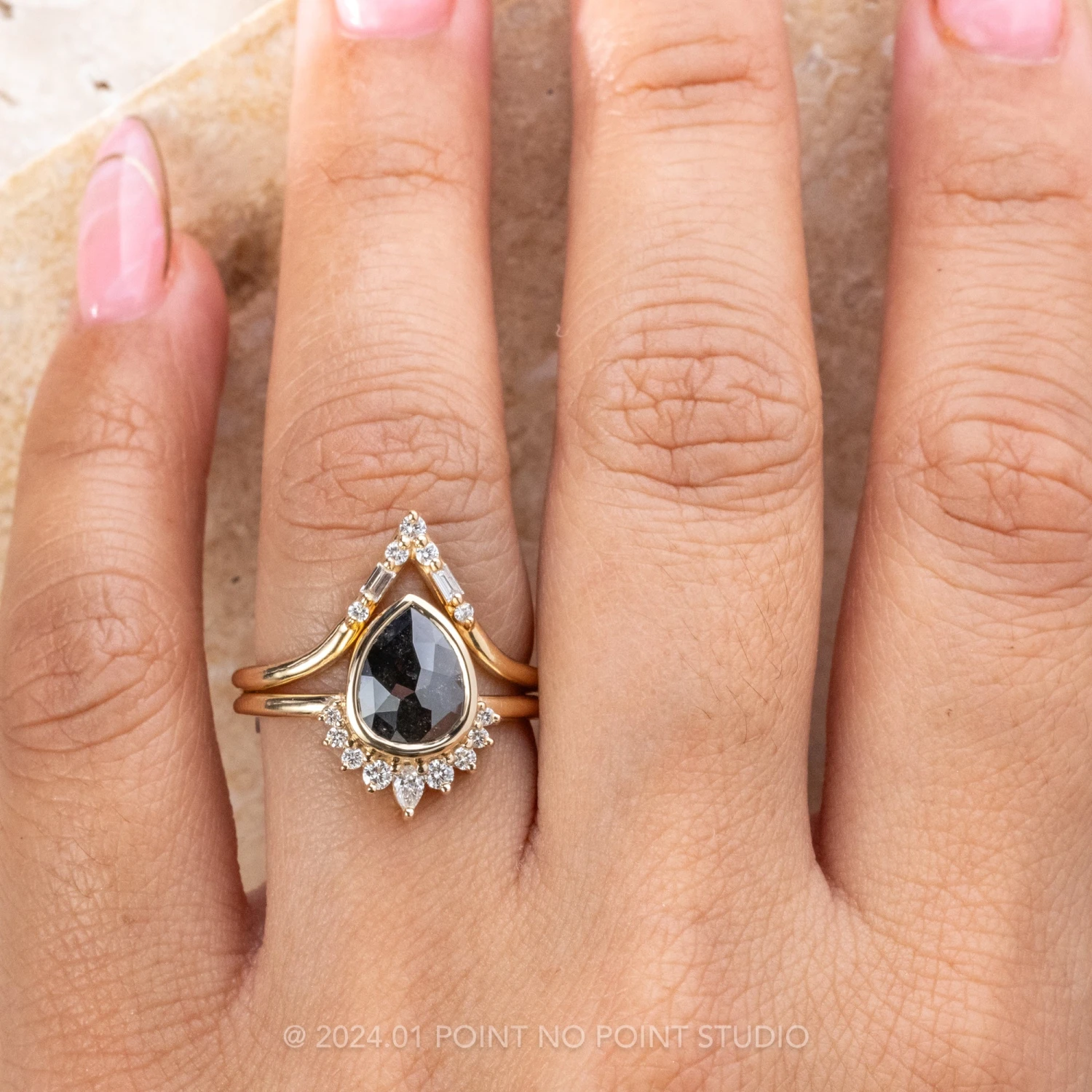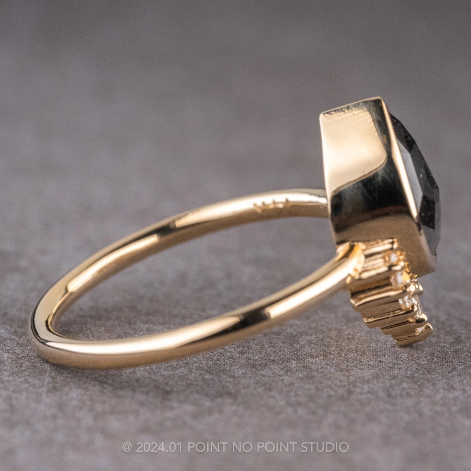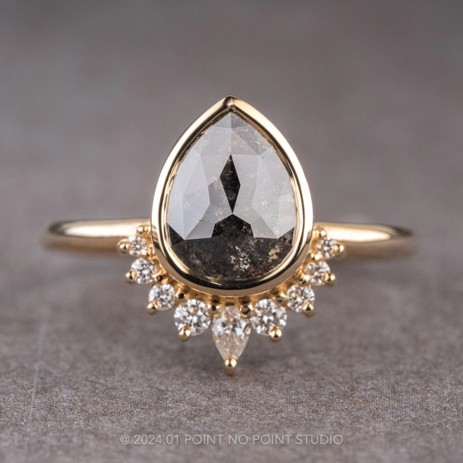 This timeless engagement ring features a striking 2.81 carat semi-translucent black speckled double cut pear diamond with a super unique tones and facets that catch the light beautifully. The diamond is a top quality natural diamond and has been set in a low profile bezel setting with a half-halo of GHSI faceted white diamonds with the focal point being a sparkly pear diamond.