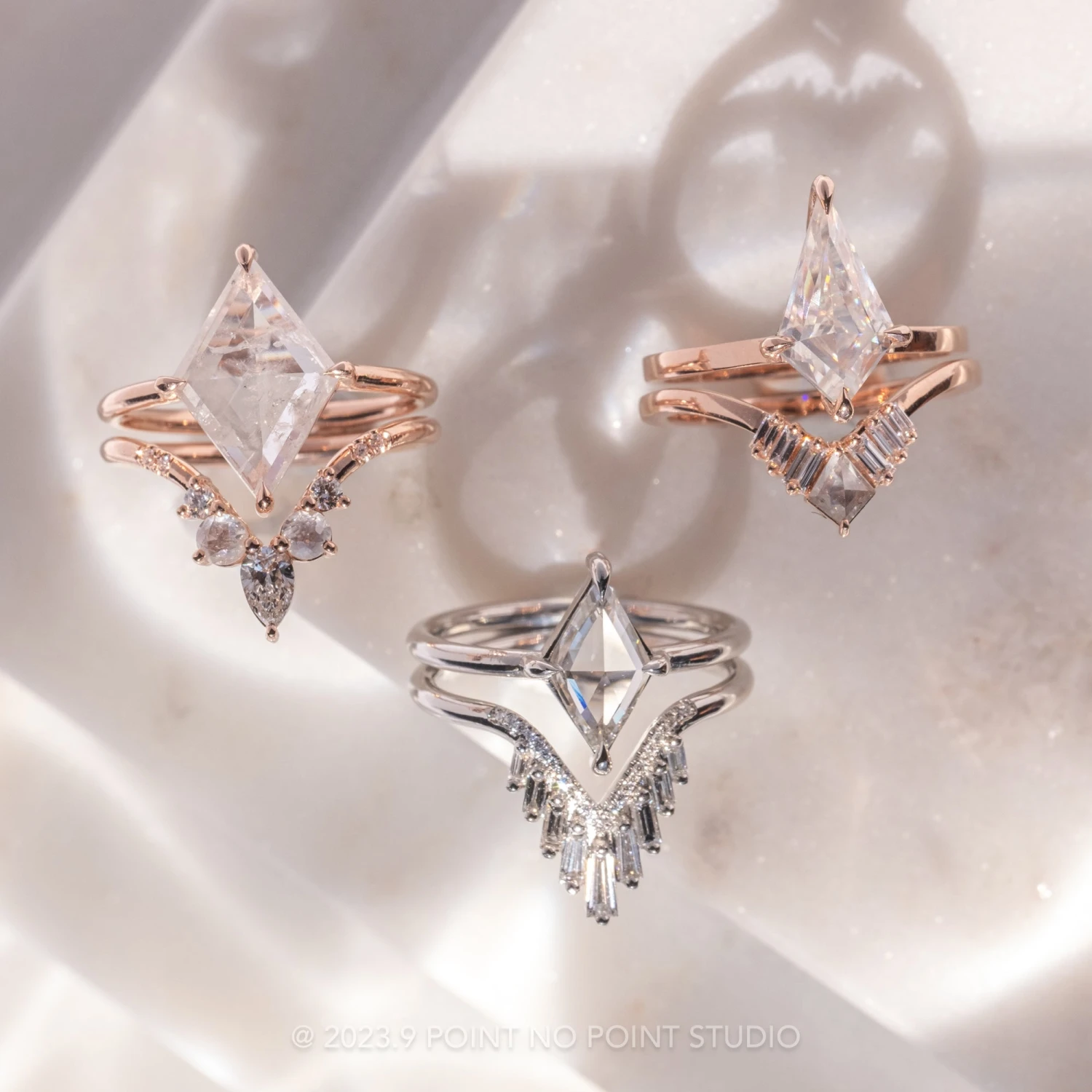 Shown pictured with our Margot, Violet, and triangle diamond Vivian wedding bands, sold separately here.