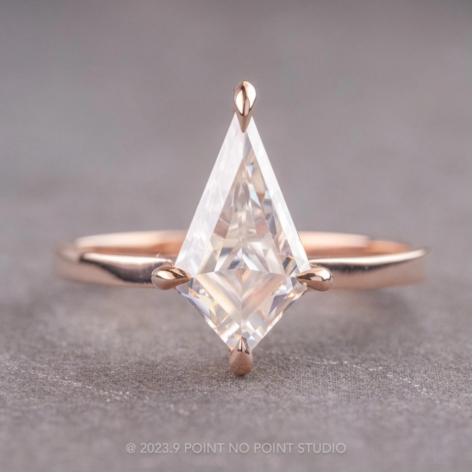 This ring features a gorgeous 2 carat kite-shaped moissanite stone. The stone is completely translucent and sparkles like there is no tomorrow!