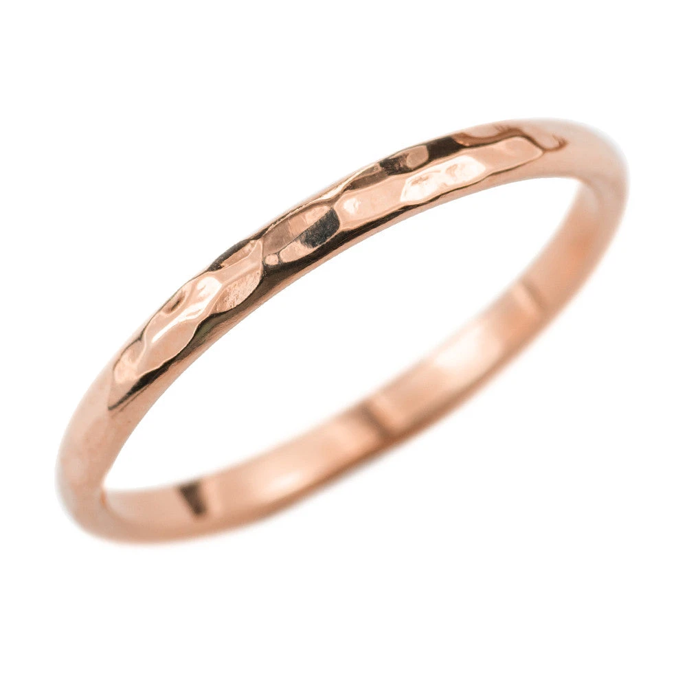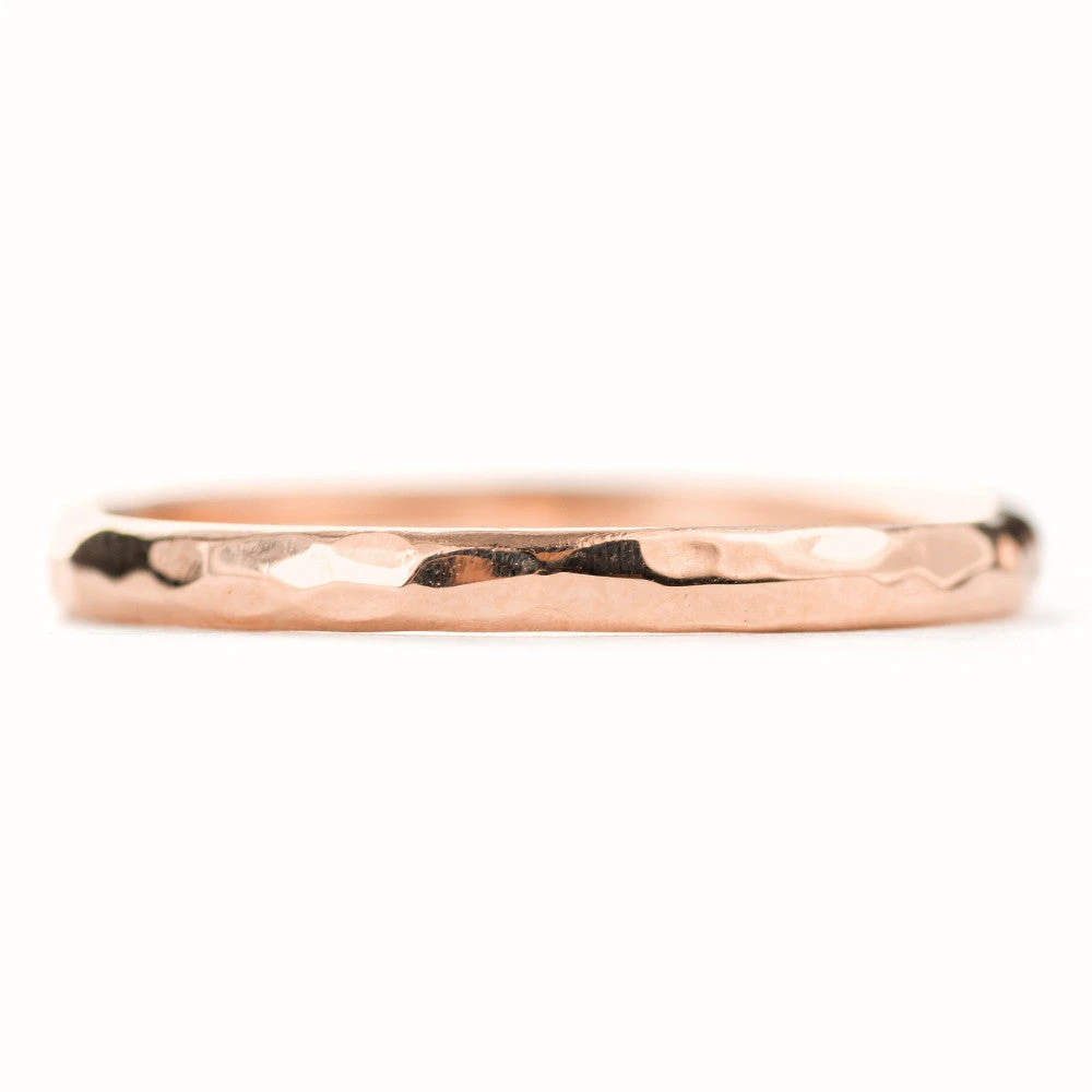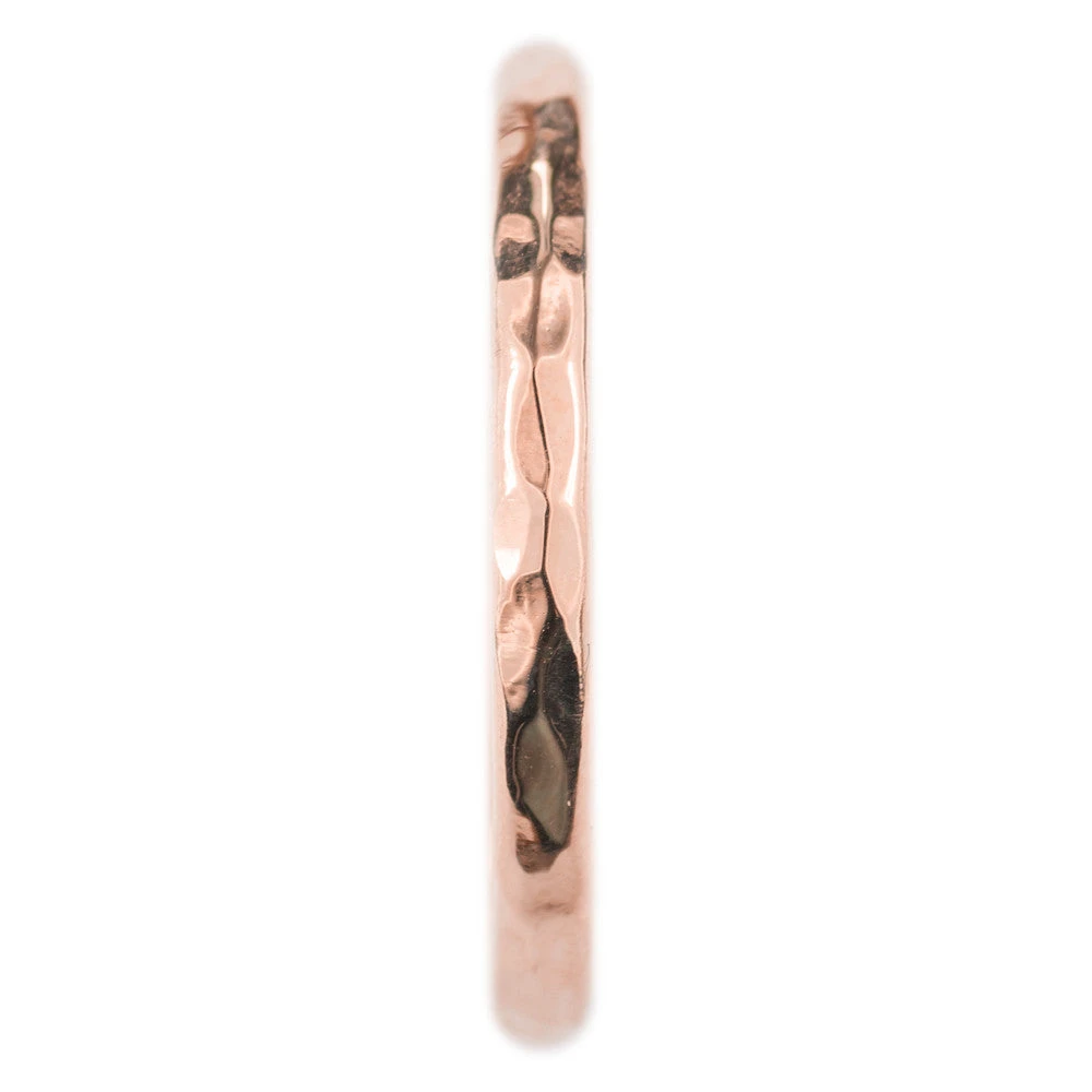 A simple hand crafted 14k rose gold hammered half round ring band.