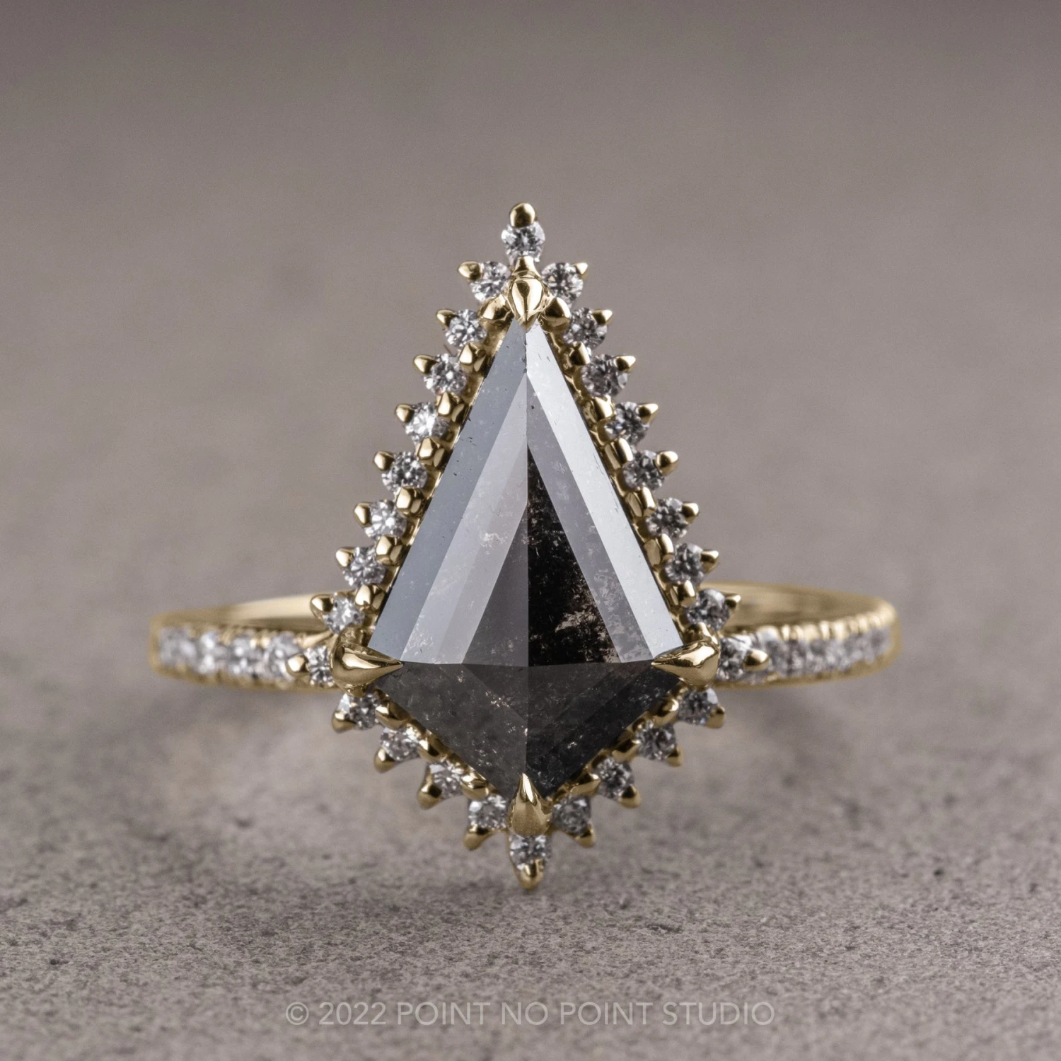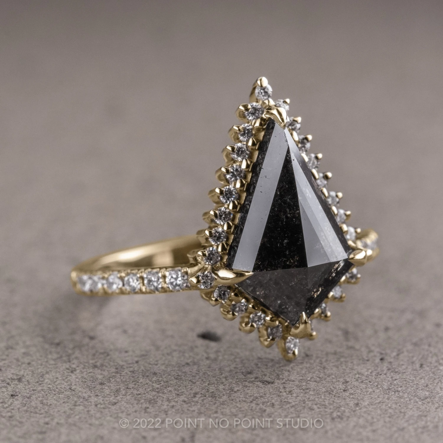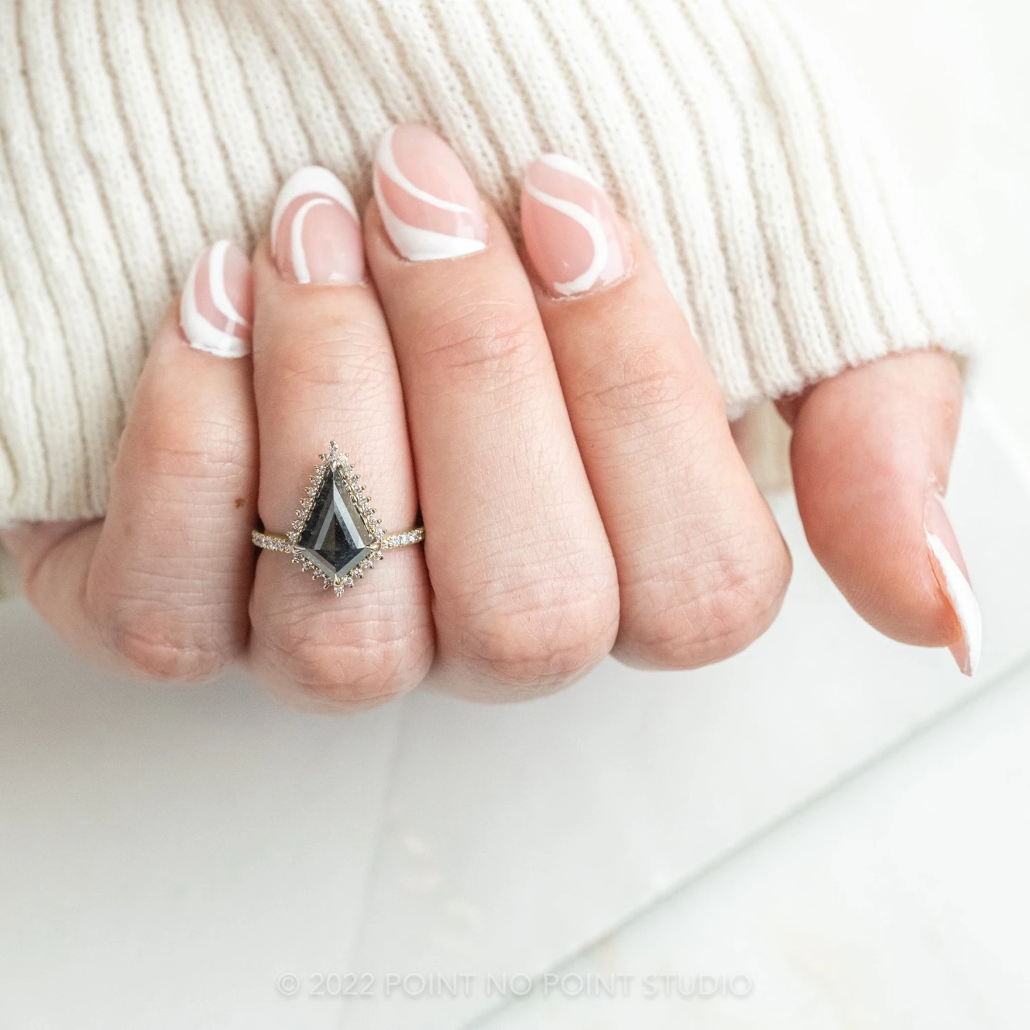 The ring features a beautiful 3.09 carat black kite shaped rose cut diamond. The diamond is a top quality natural diamond and has been set into an open back setting, allowing the light to shine through the diamond. The kite diamond is surrounded by a halo of GHSI white diamonds, along with diamonds set into the ring band. Each of the diamonds in the band is set in a tiny prong setting, which displays more of the diamond and enhances sparkle.
