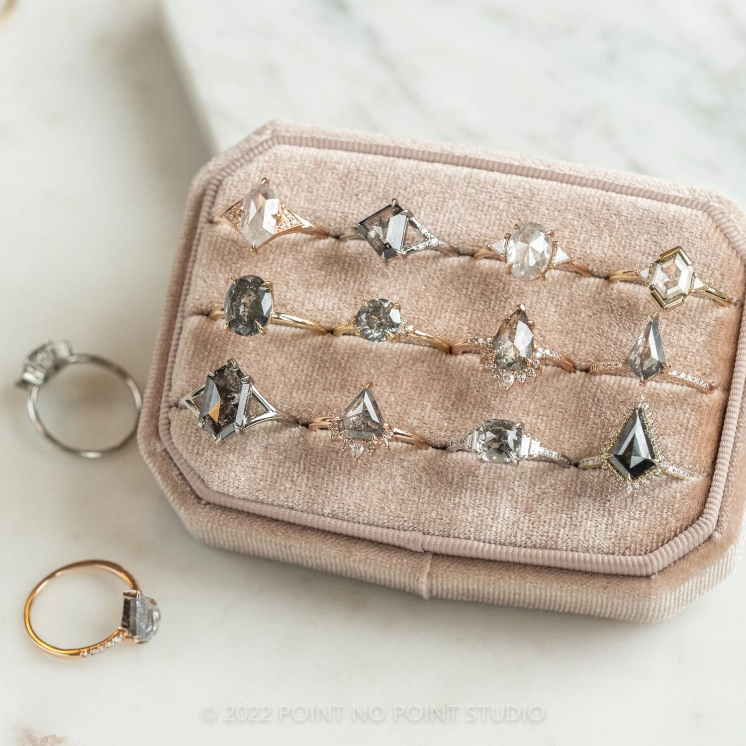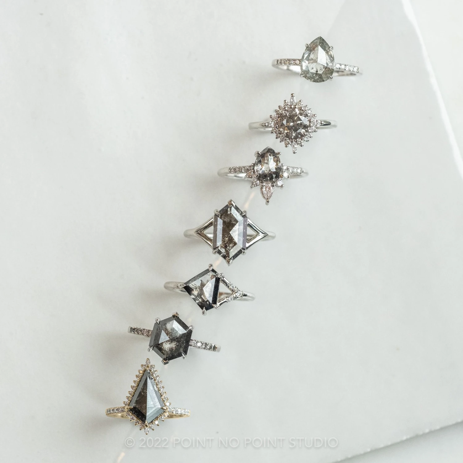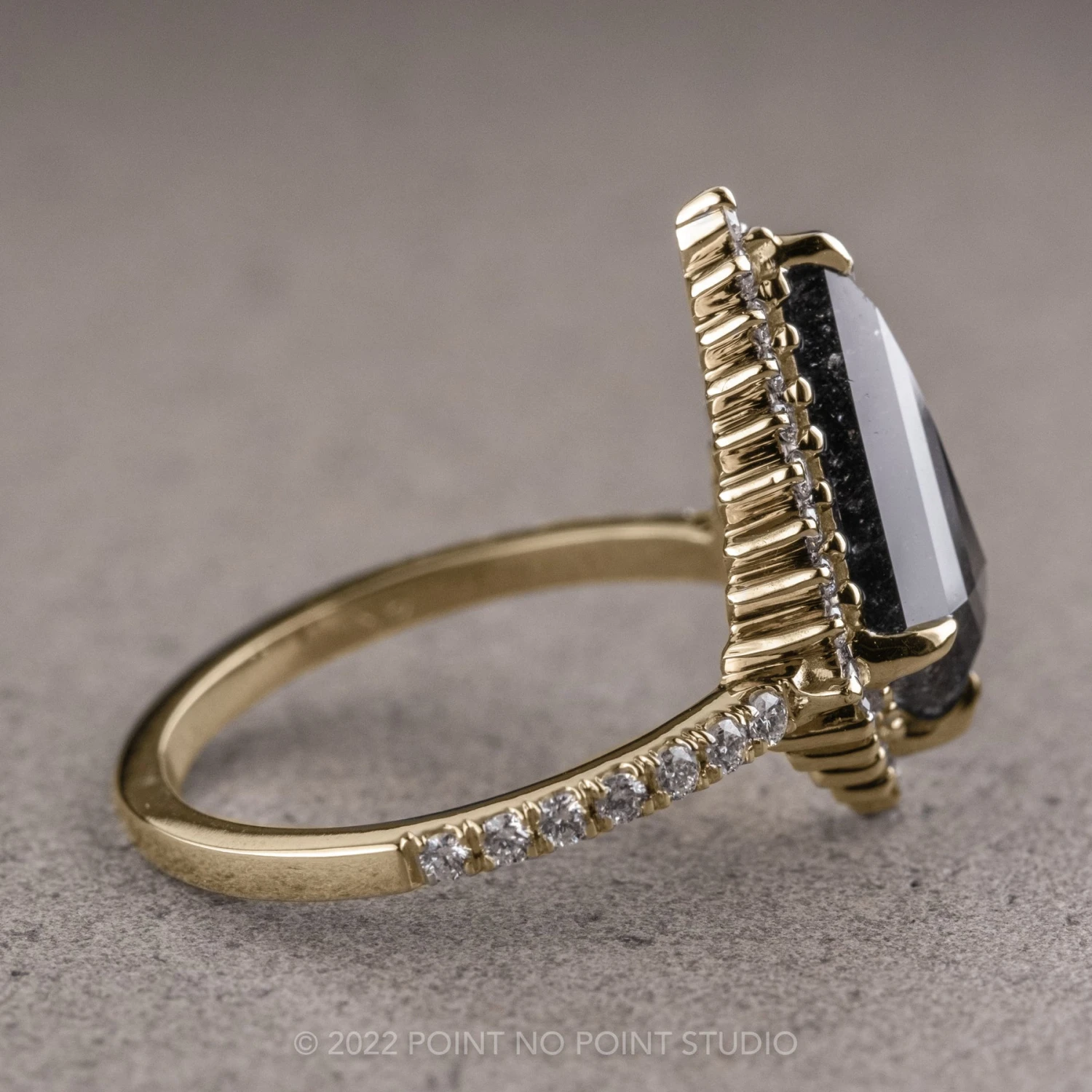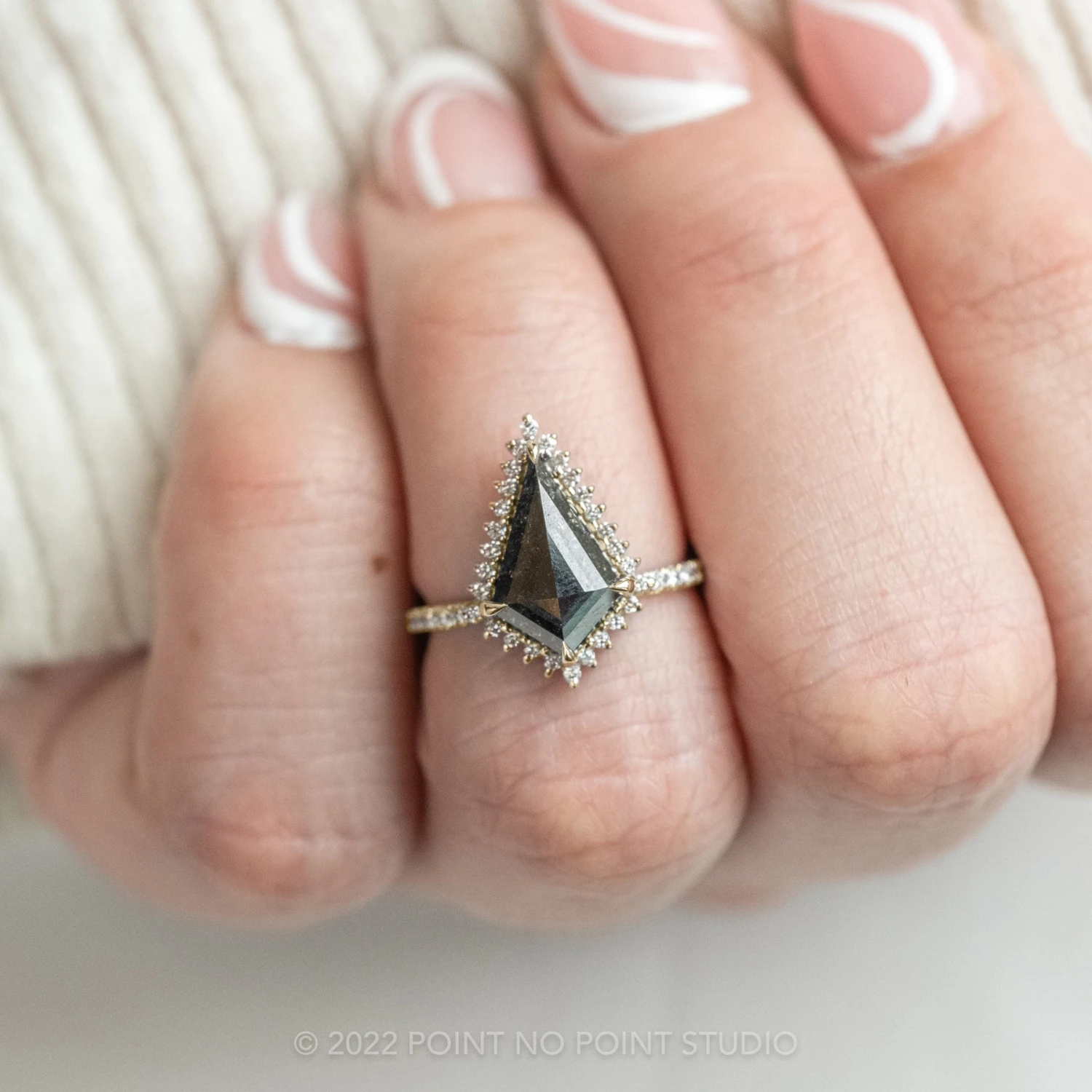 The ring features a beautiful 3.09 carat black kite shaped rose cut diamond. The diamond is a top quality natural diamond and has been set into an open back setting, allowing the light to shine through the diamond. The kite diamond is surrounded by a halo of GHSI white diamonds, along with diamonds set into the ring band. Each of the diamonds in the band is set in a tiny prong setting, which displays more of the diamond and enhances sparkle.