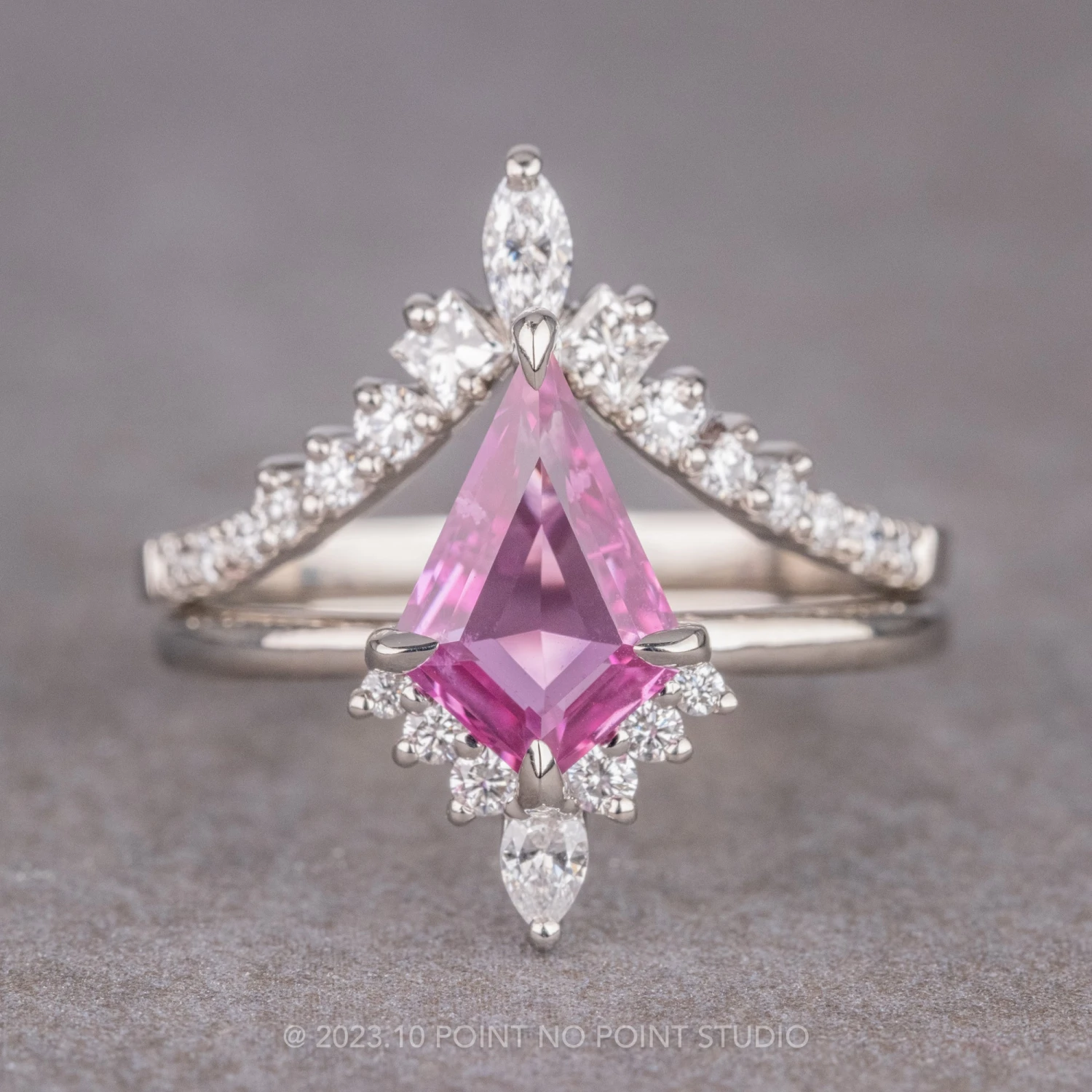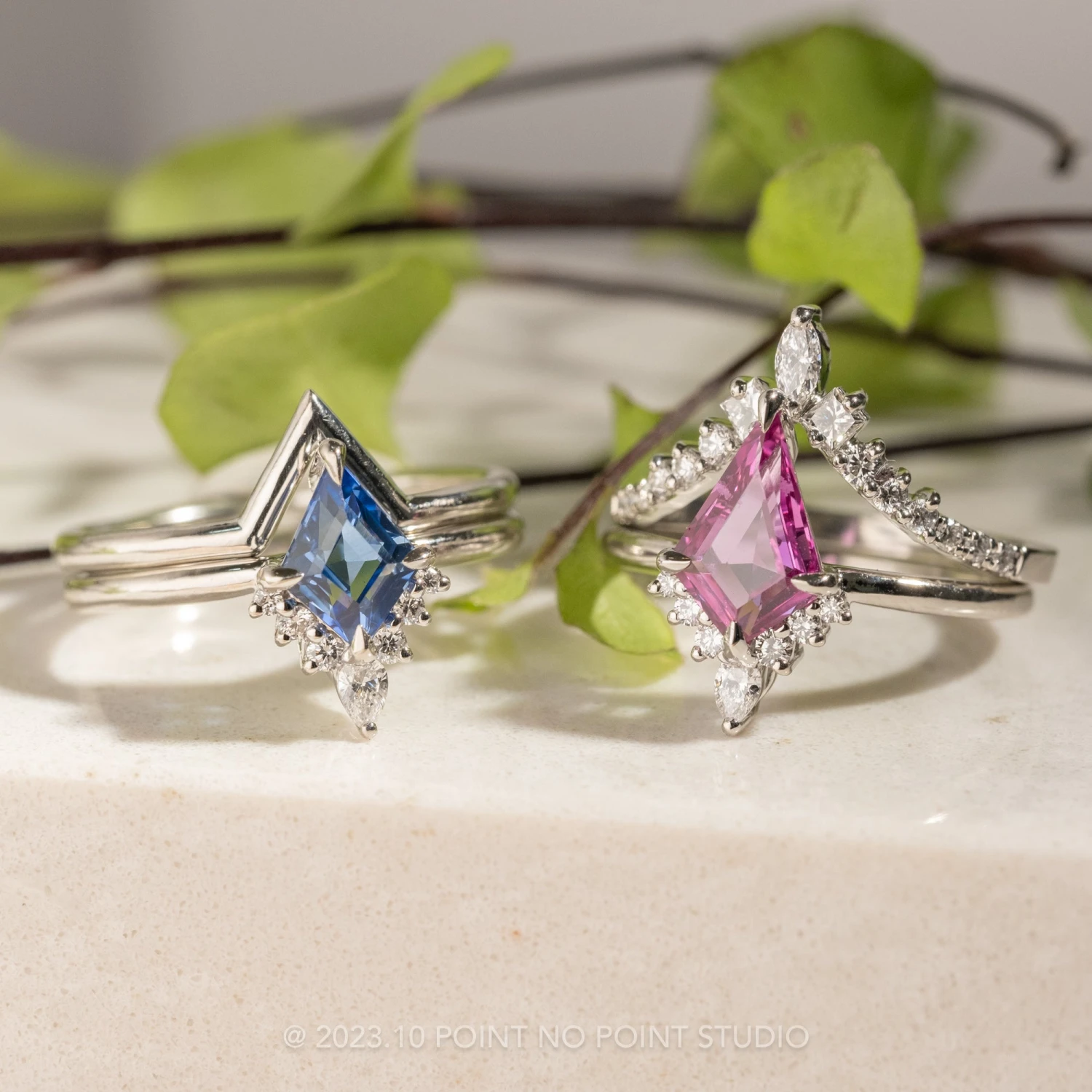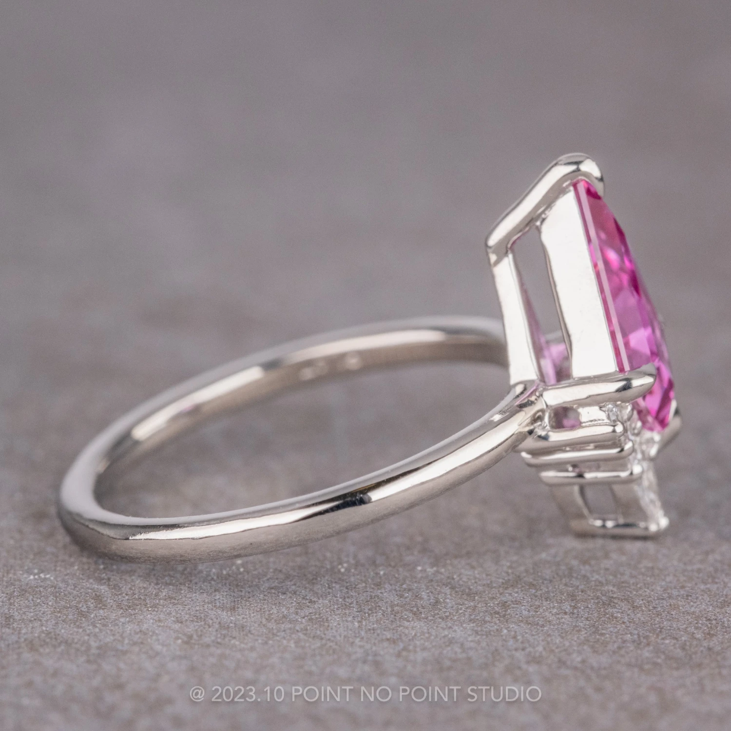 This stunning engagement ring features a natural 3.30 carat kite shaped sapphire. Nestled below the gemstone is a crown of GHSI faceted white diamonds with the focal point being a pear shaped diamond.