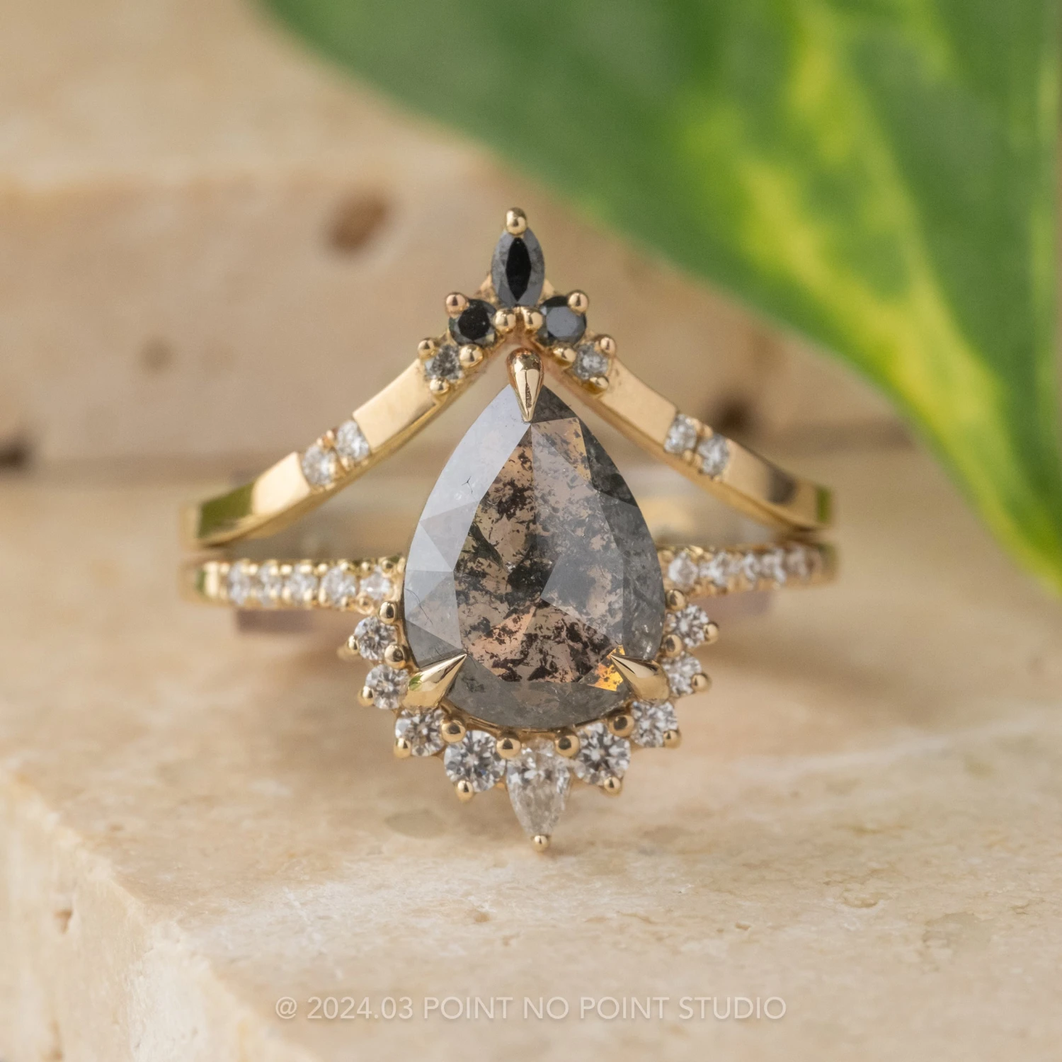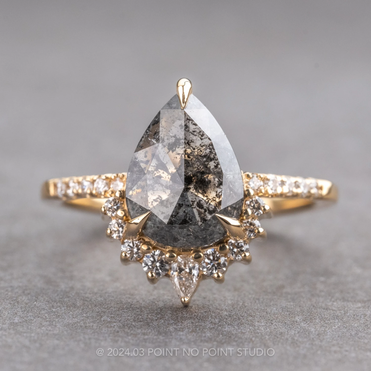 This timeless engagement ring features a STUNNING 3.38 carat salt and pepper double cut pear diamond. The diamond is a top quality un-enhanced natural diamond; it is semi-translucent with unique tones and facets that catch the light. The pear diamond sits on top of a sparkly half-halo of GHSI faceted white diamonds with the focal point being a white pear diamond. Set into the band are five GHSI faceted white diamonds to complete the look!