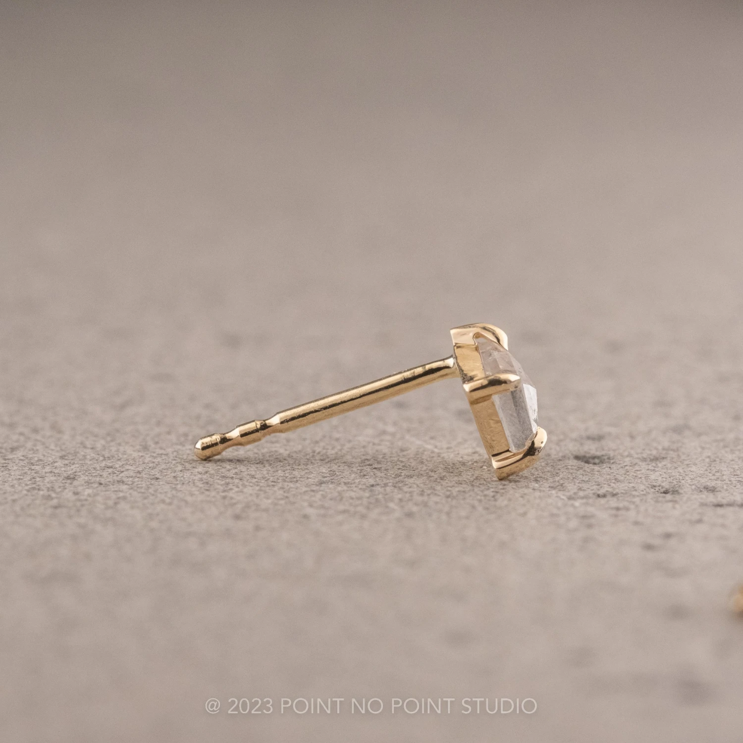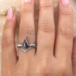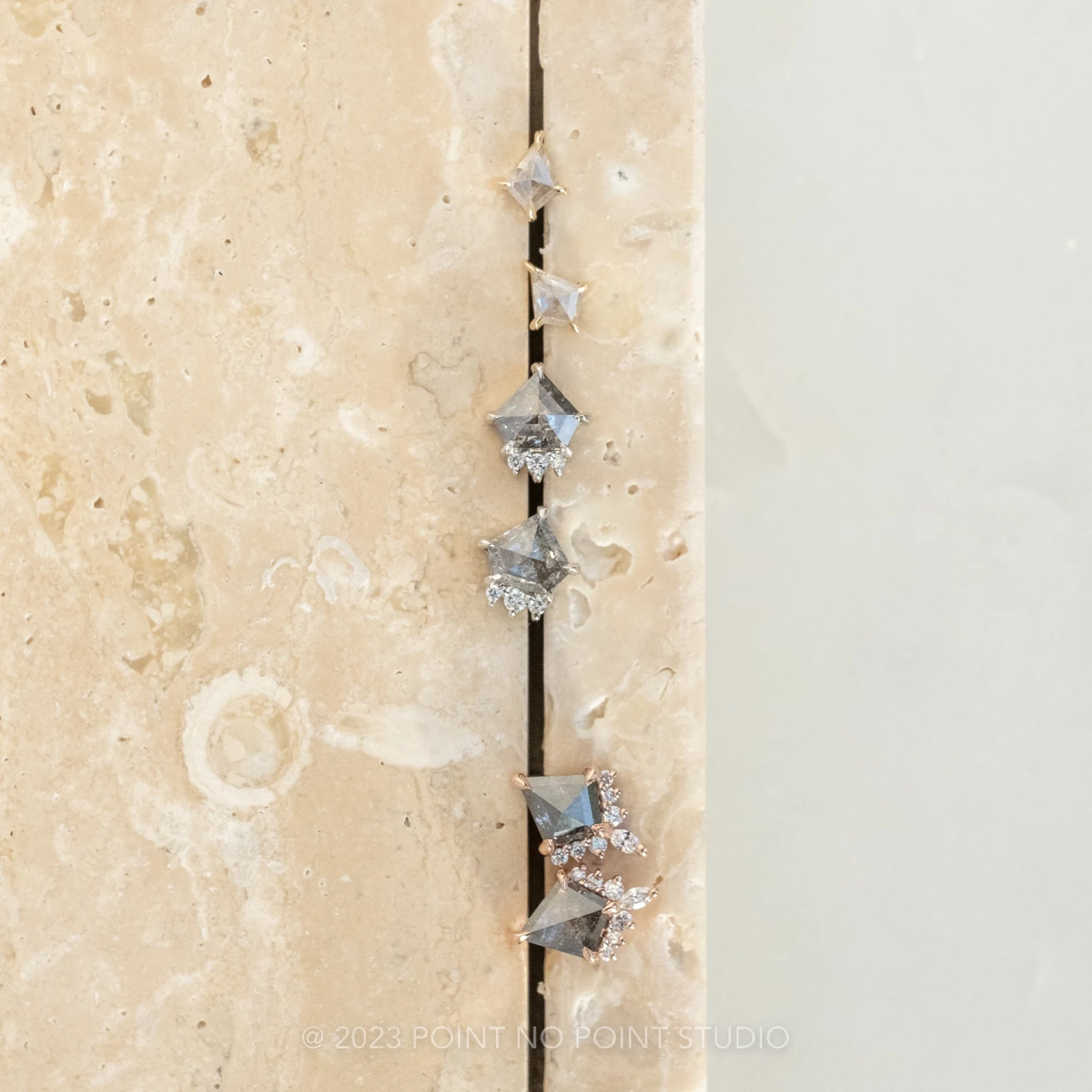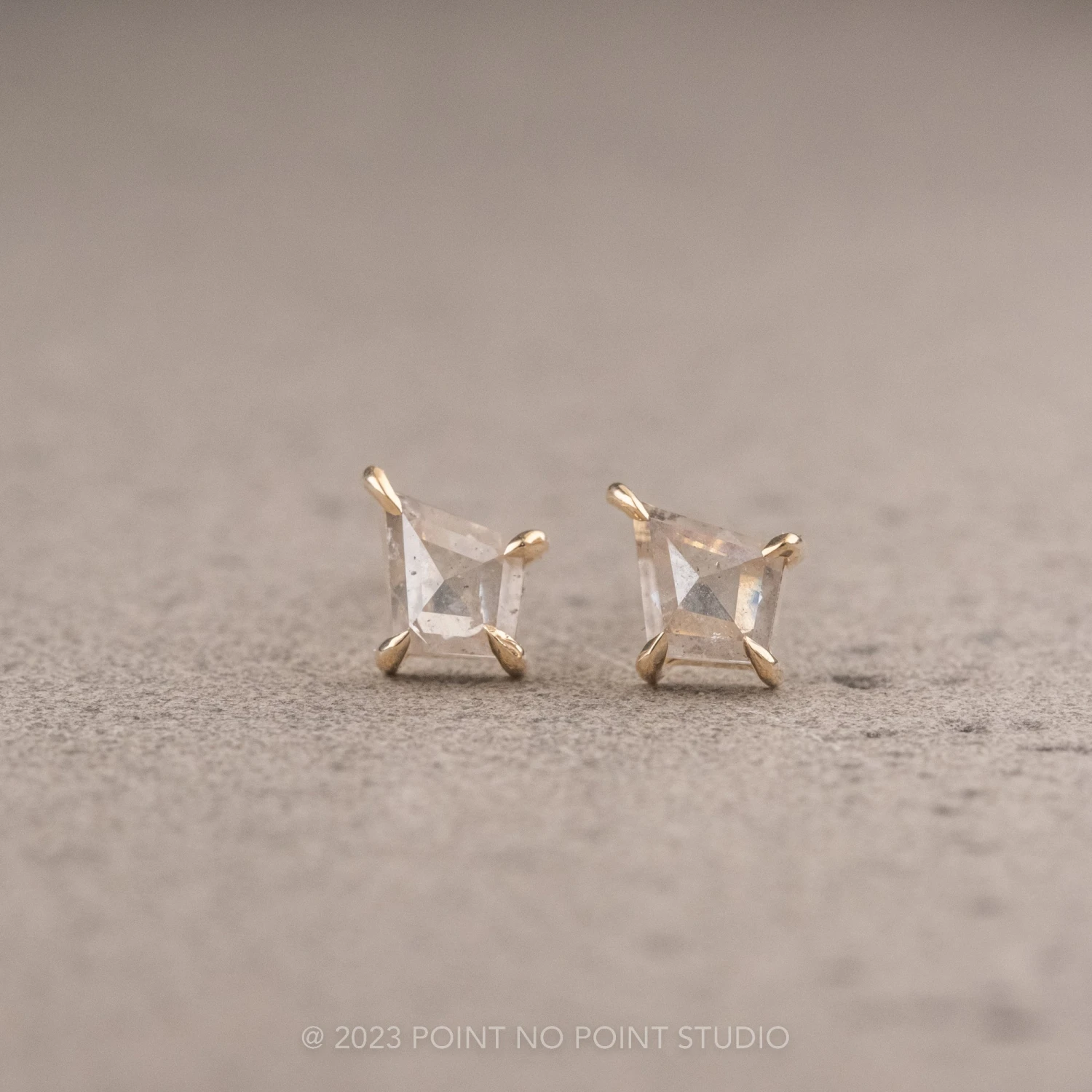 Each of these unique earrings feature a stunning salt and pepper kite diamond – the diamonds are slightly icy and speckled.