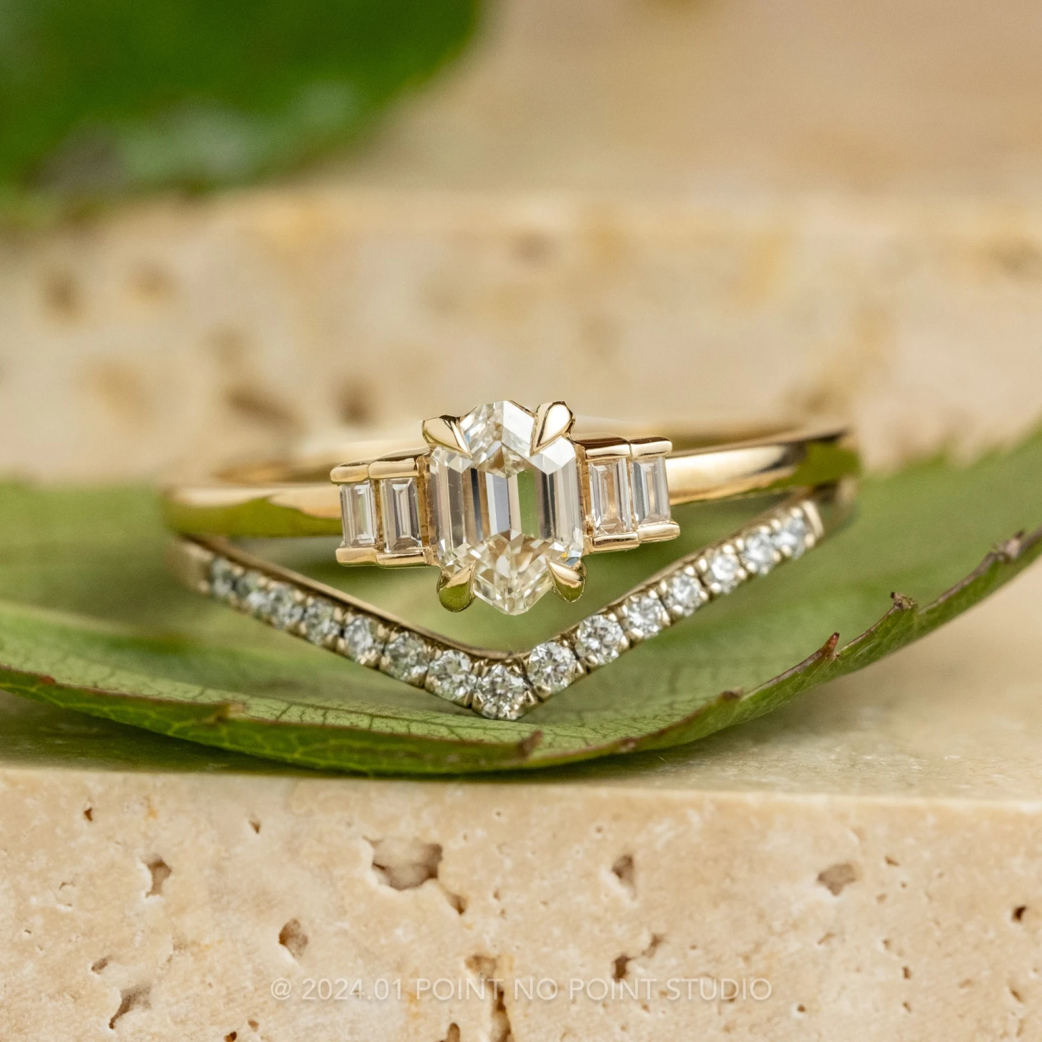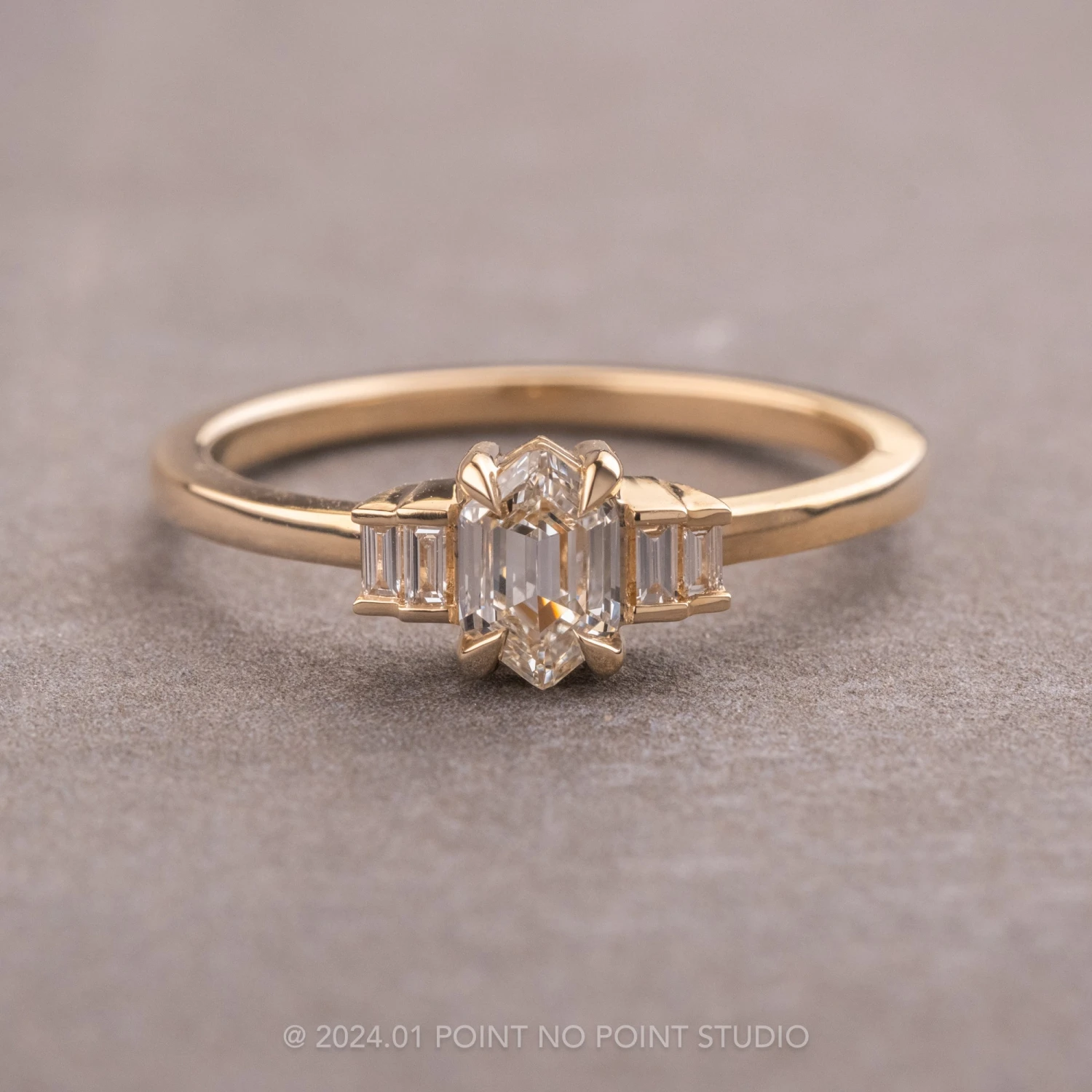 This ring features a stunning .42 carat clear hexagon step cut diamond. The diamond is a top quality, all natural un-enhanced diamond. Flanked on either side of the hexagon diamonds are 2 GHSI white baguette diamonds. The ring sparkles like no tomorrow!