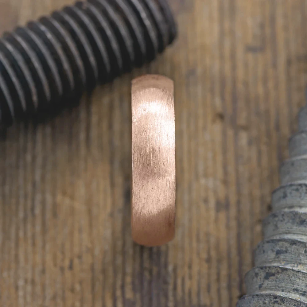 This ring is made of solid recycled eco friendly 14k recycled peach gold. The band is so simple and traditional. The outside of the ring has been given a brushed matte finish and the inside and edges of the ring a high polished finish.