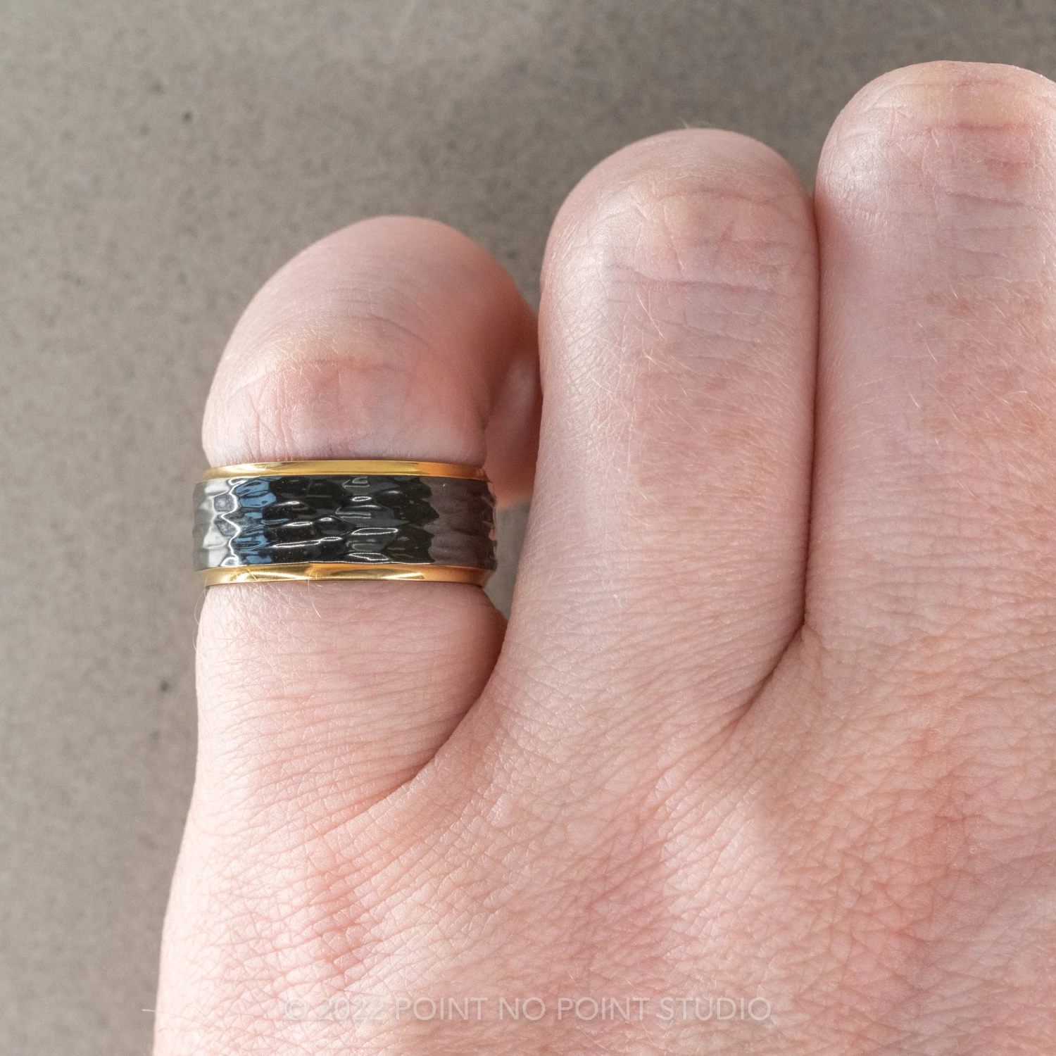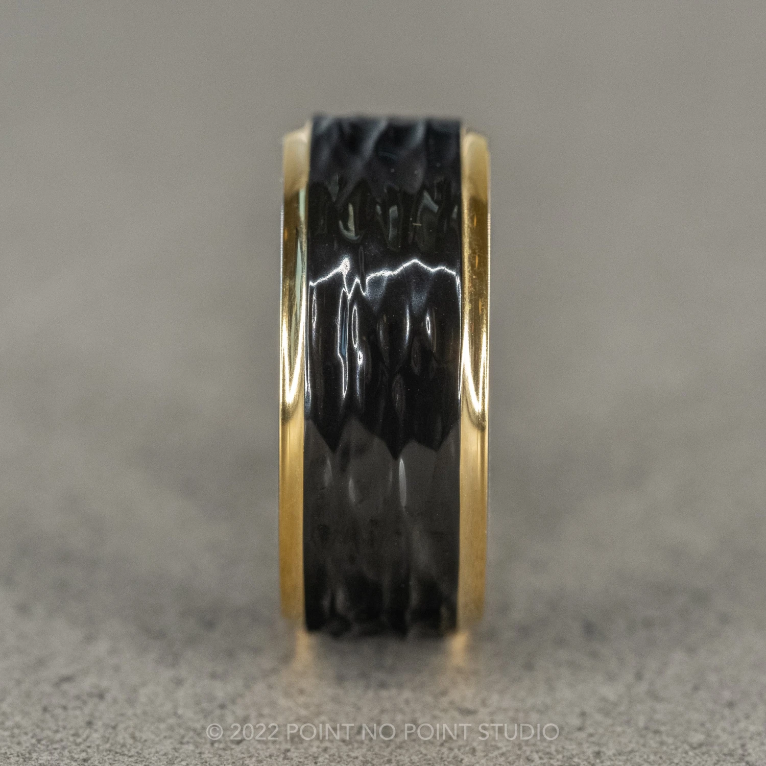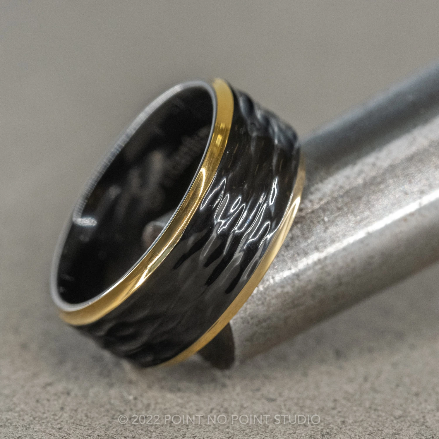 This unique ring is made of black titanium material. The tapered edges are plated with 18k yellow gold PVD plating. PVD gold plating is thicker than standard gold plating so it will last longer than a normal gold plated ring. The outside of the ring has been given a hammered glossy finish.