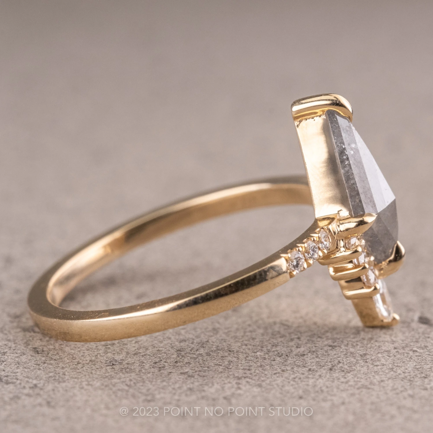 This timeless engagement ring features a .74 carat salt and pepper kite diamond. The setting features a half-halo of faceted GHSI white diamonds with the focal point being a marquise shaped diamond. Down each side of the band are 3 GHSI white round accent diamonds. The entire ring is made of recycled 14k yellow gold.