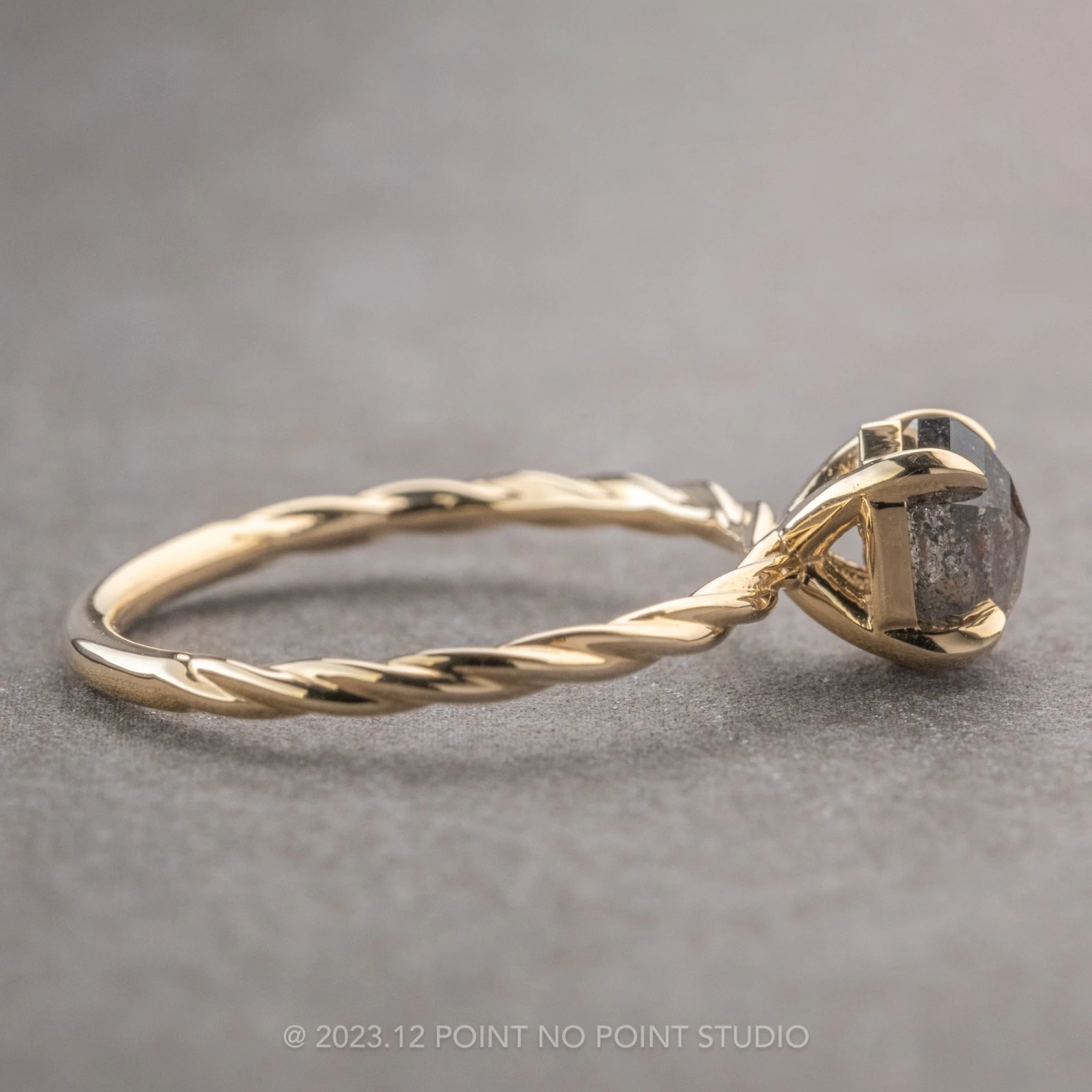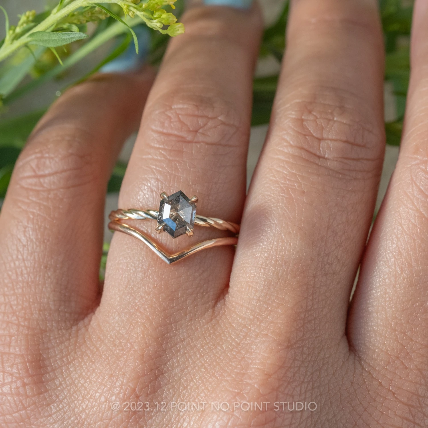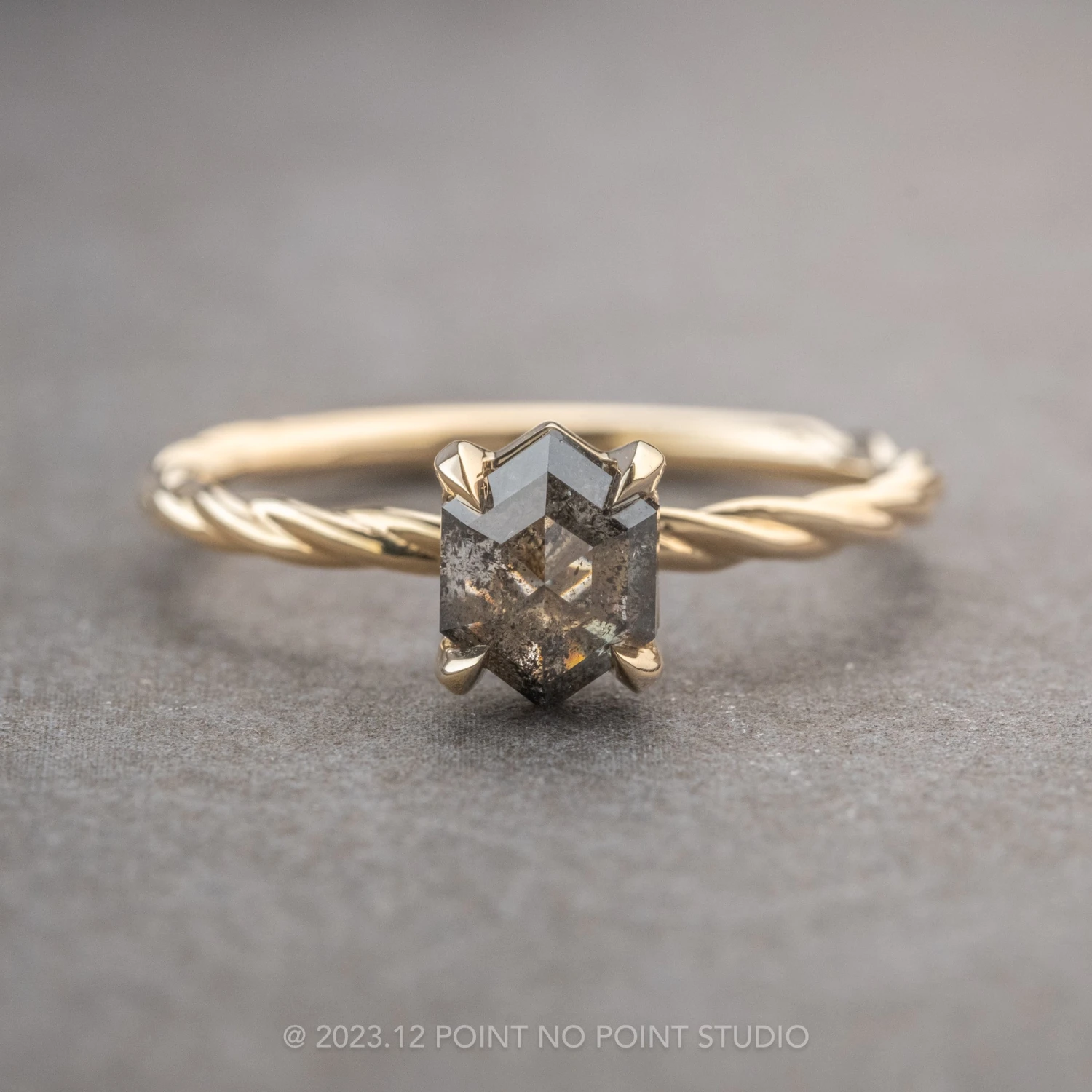 This non-traditional take on a timeless engagement ring features a stunning .93 carat salt and pepper rose cut hexagon diamond. This diamond is a top-quality, natural diamond that has not been heat treated or enhanced in any way.