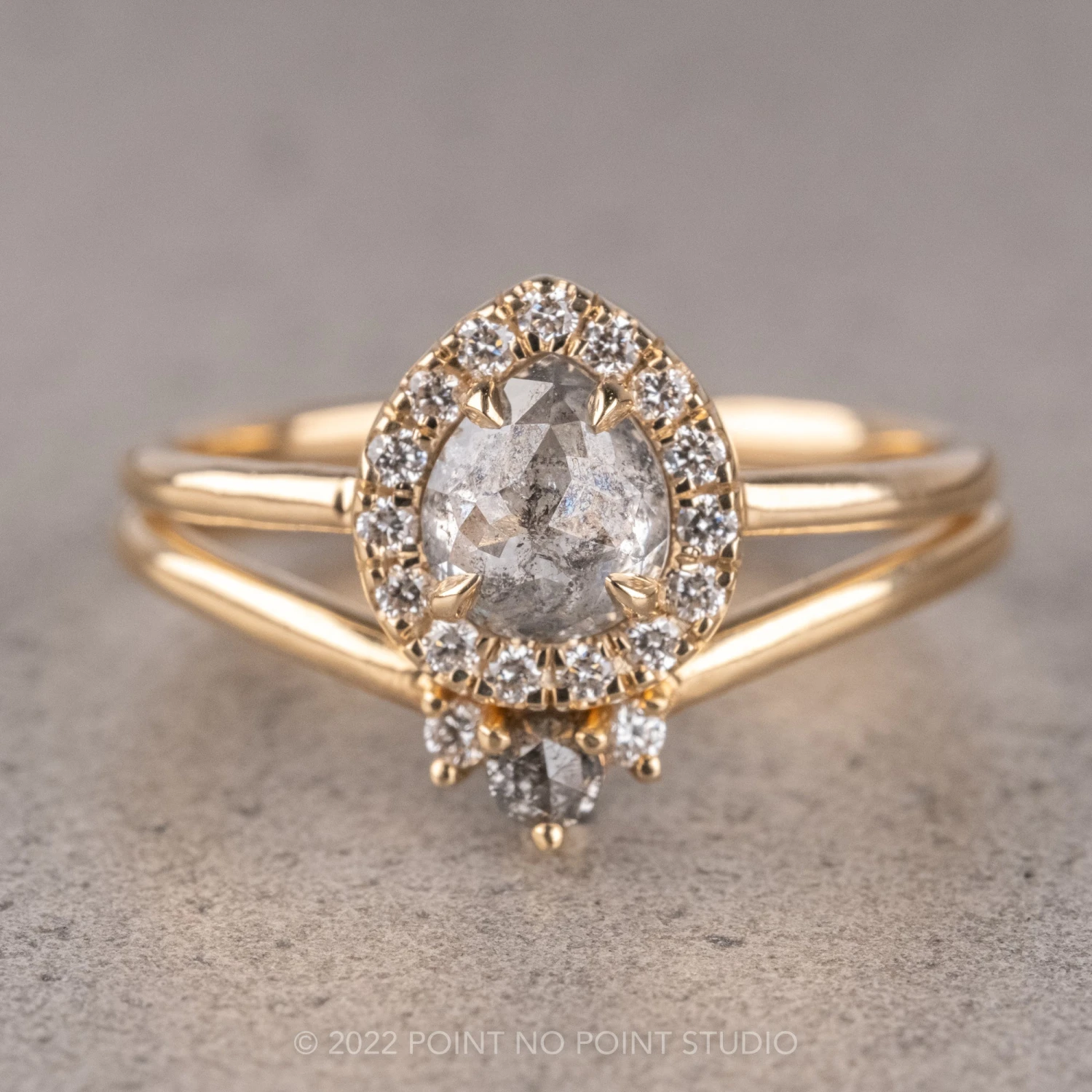 Our spin on a timeless classic, this engagement ring features a .84 carat semi-translucent salt and pepper pear shaped rose cut diamond. The pear diamond is an all-natural, top quality stone that has not been heat treated or enhanced in anyway.