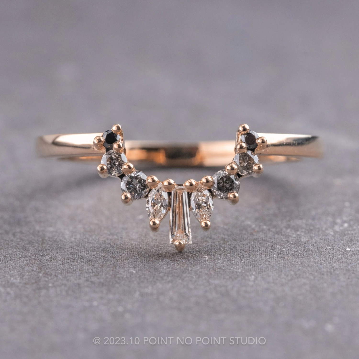 This timeless and unique wedding ring features a striking natural baguette diamond at the center of the contour. The tapered baguette diamond is accented by a gradient of white, grey and black diamonds in various shapes. This rounded wedding band can be worn alone, stacked in multiples or to match any number of PNPS engagement rings!