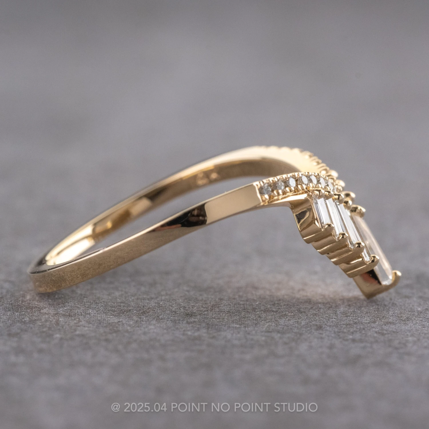 This stunning wedding ring features a v-contour of sparkly GHSI white baguette diamonds with a striking moonstone tapered baguette as the focal point. Set above the baguettes is a row of brilliant cut round diamonds for that extra sparkle! This band can be worn alone, stacked in multiples or to match any number of engagement rings.