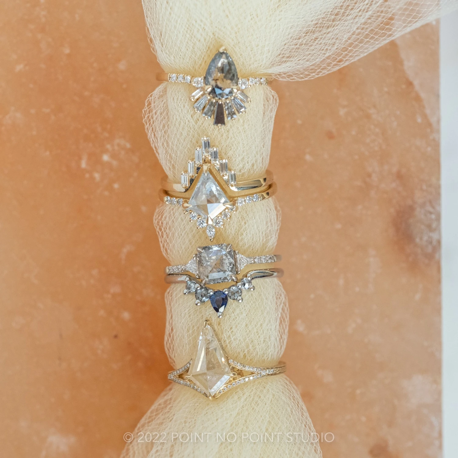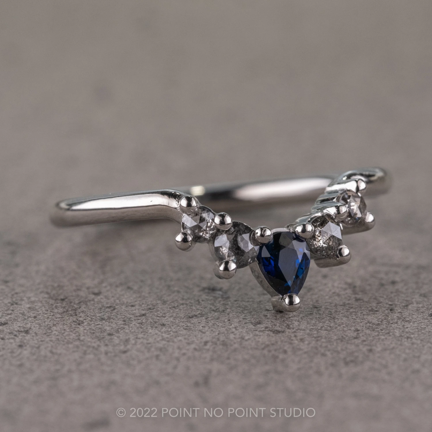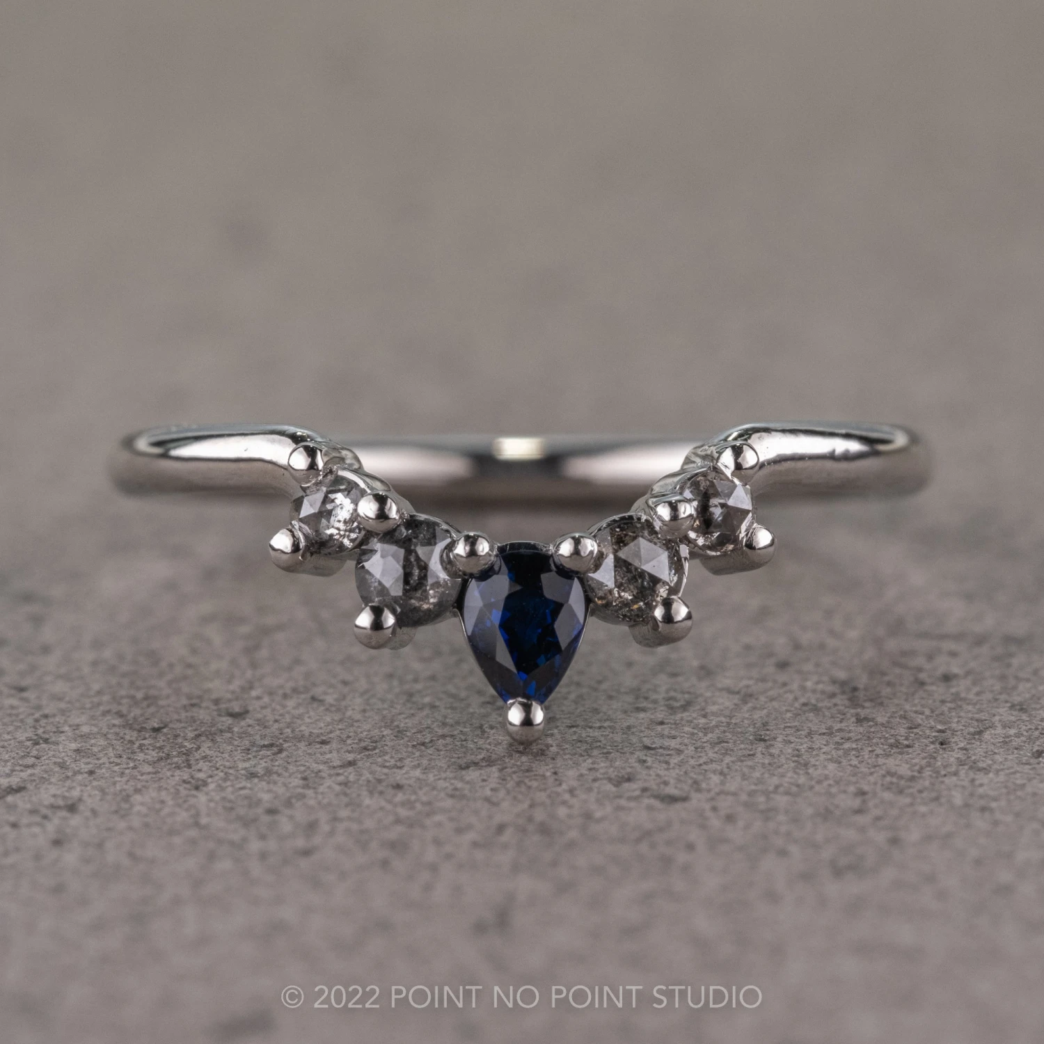 This timeless and unique wedding ring features a stunning pear sapphire as the central focal point with natural rose cut diamonds on either side.