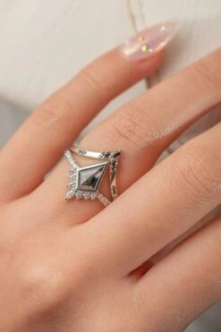 1.40 Carat Black Speckled Hexagon Diamond Engagement Ring, Ombre Eliza Setting, Platinum