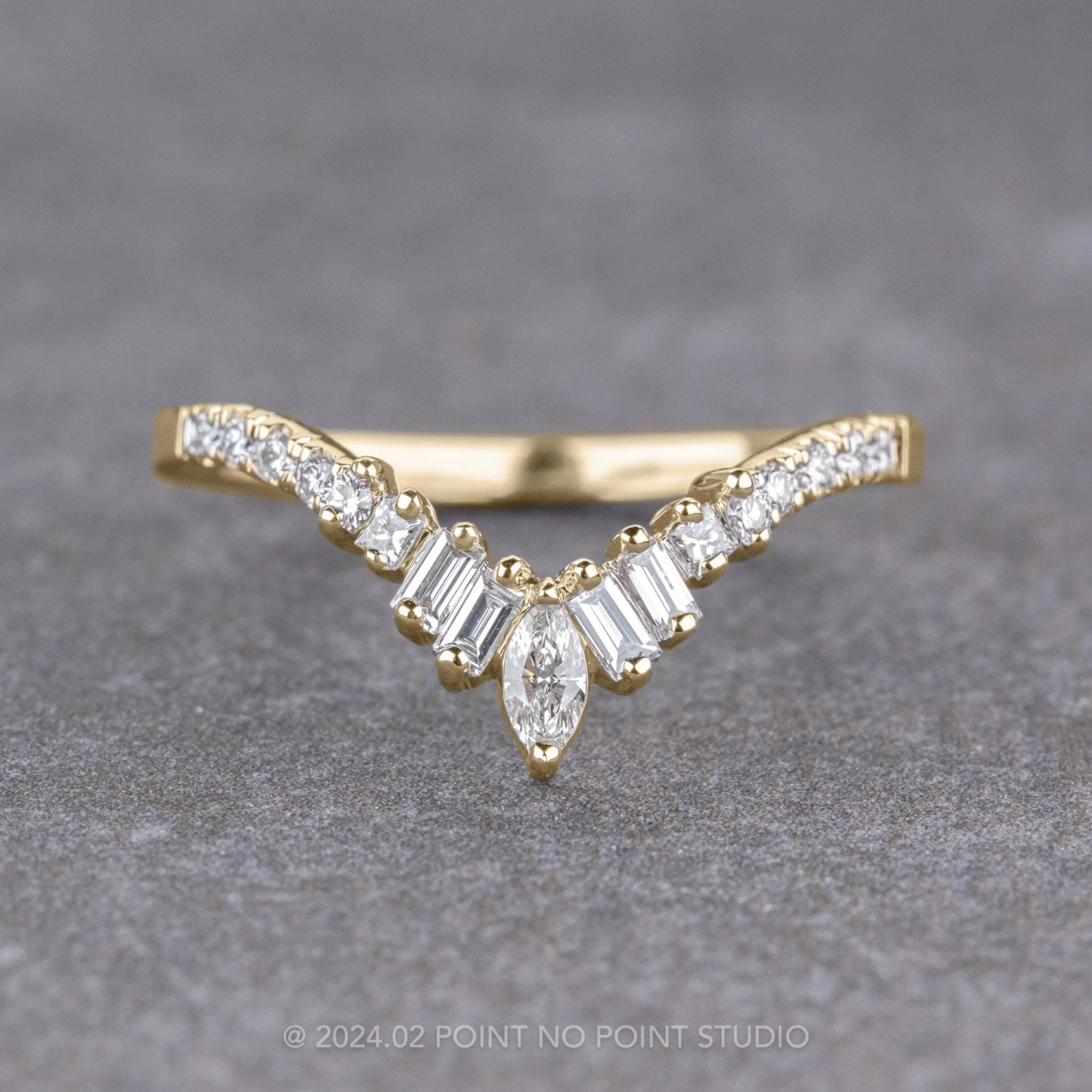 This stunning wedding ring features a v-contour of sparkly GHSI white diamonds in various shapes, with a striking marquise diamond at the tip that will complement many different engagement ring styles! This band can be worn alone, stacked in multiples or to match any number of engagement rings.