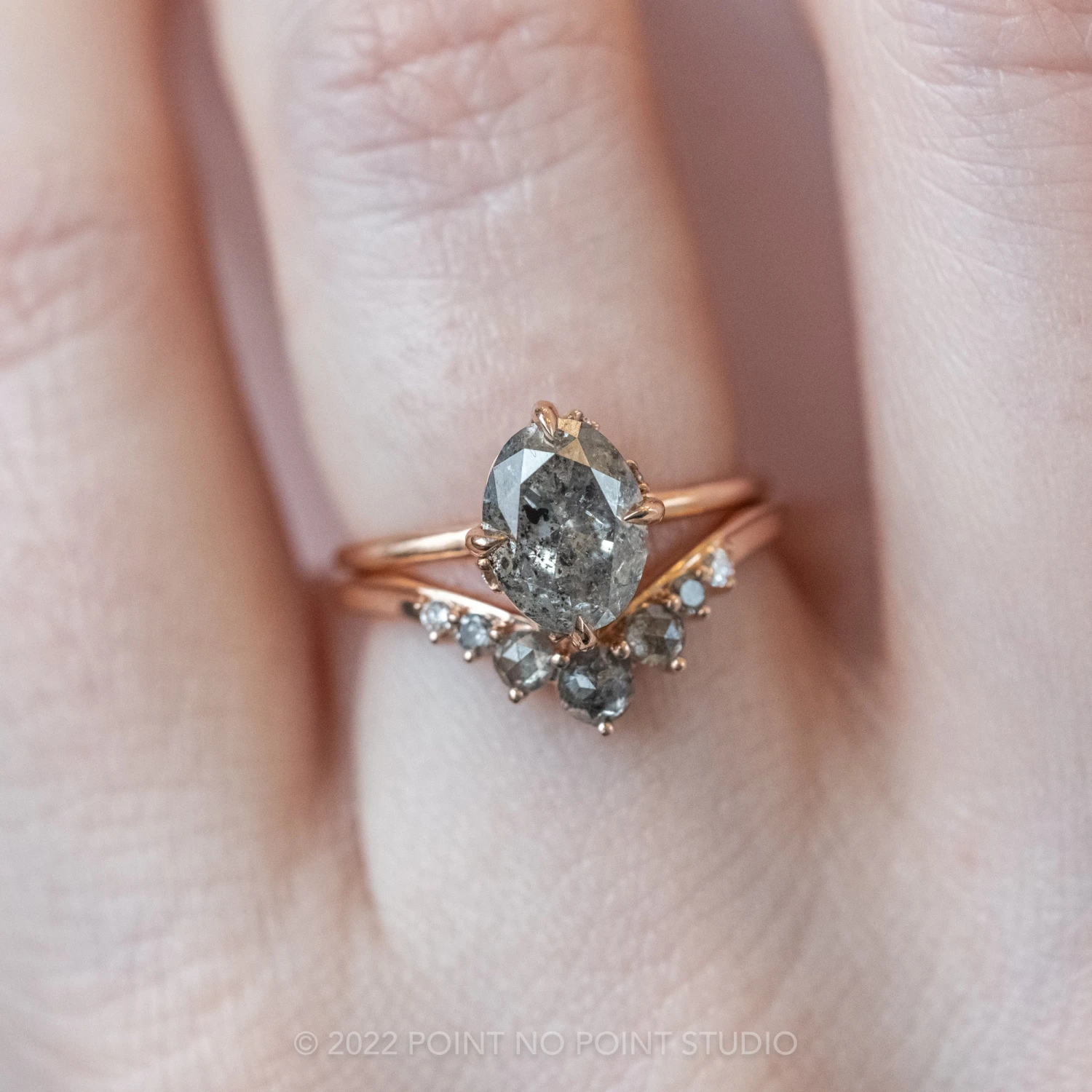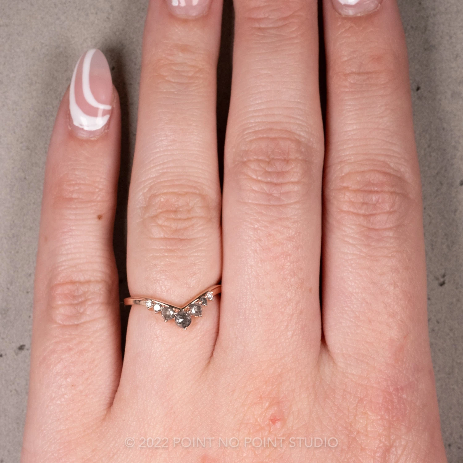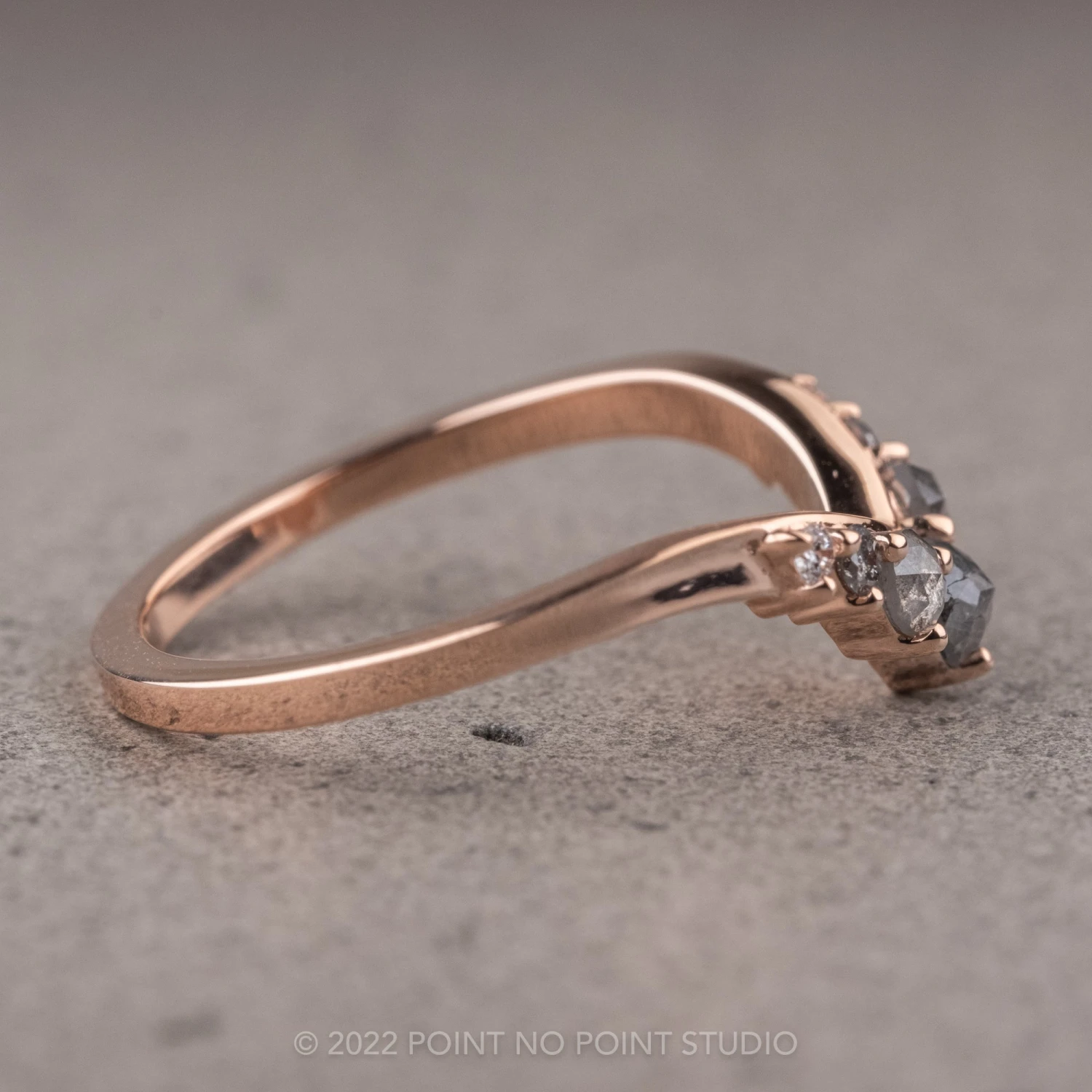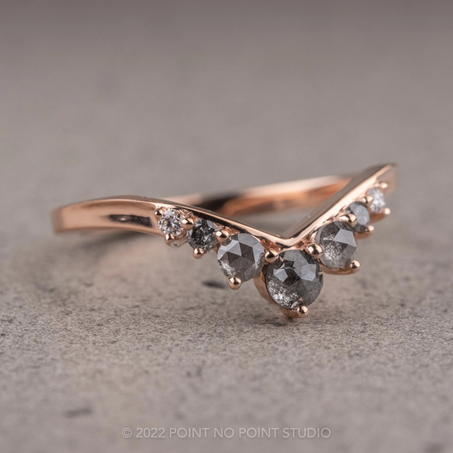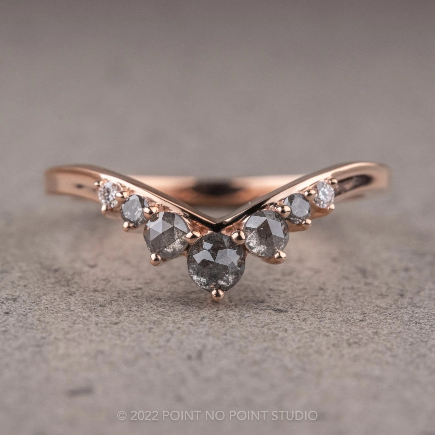 This timeless and unique wedding ring features a smooth gradient of striking light grey natural rose cut diamonds with salt and pepper and white brilliant cut diamonds. The ring features a soft diamond contoured curve, which will flatter many engagement ring styles (as shown with our engagement rings, sold separately).