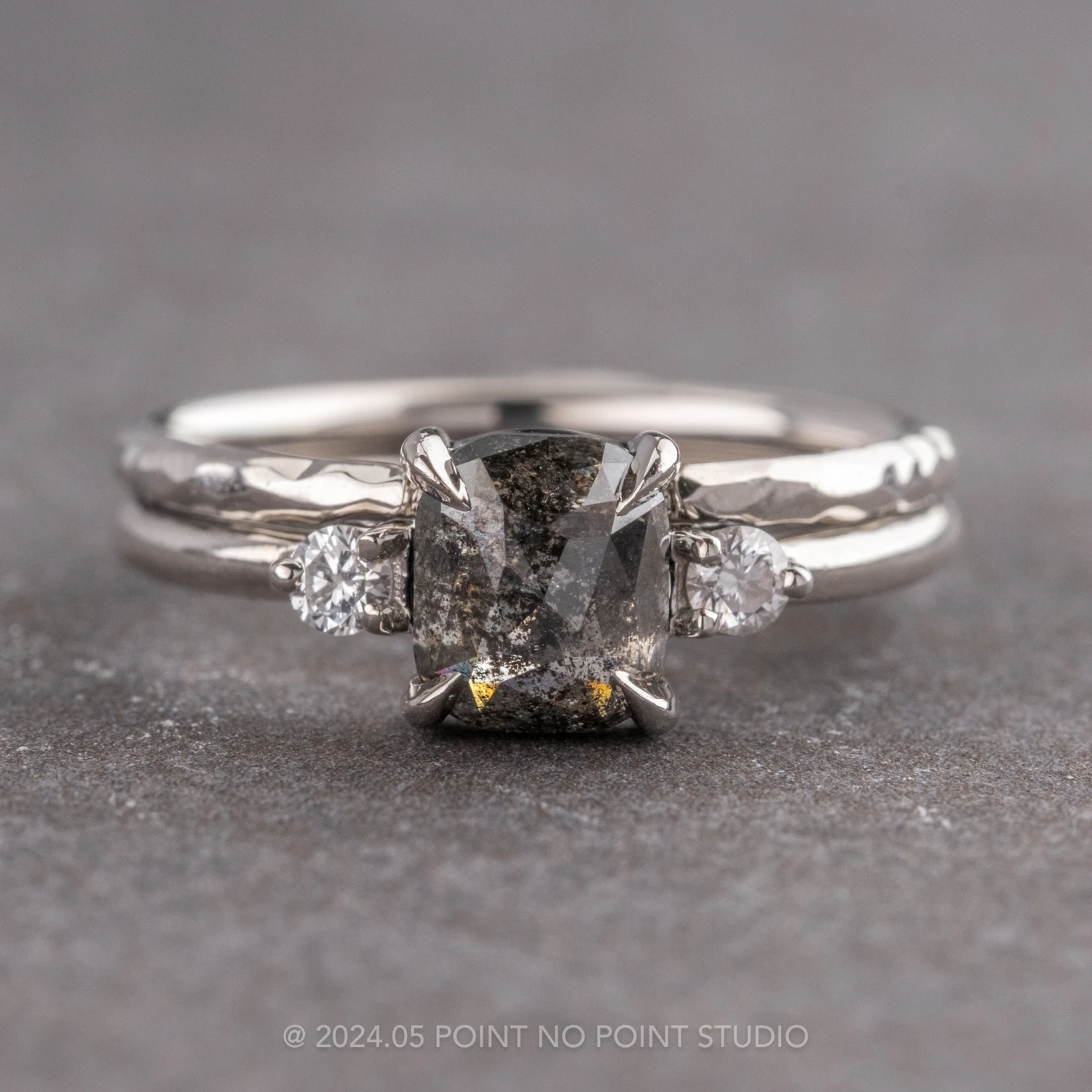 The unique ring features a versatile open cuff design that will complement almost any engagement ring! The open cuff design allows the ring to sit on the sides of just about any engagement ring stone. The entire ring is made of eco friendly 14k White Gold with a hammered finish.