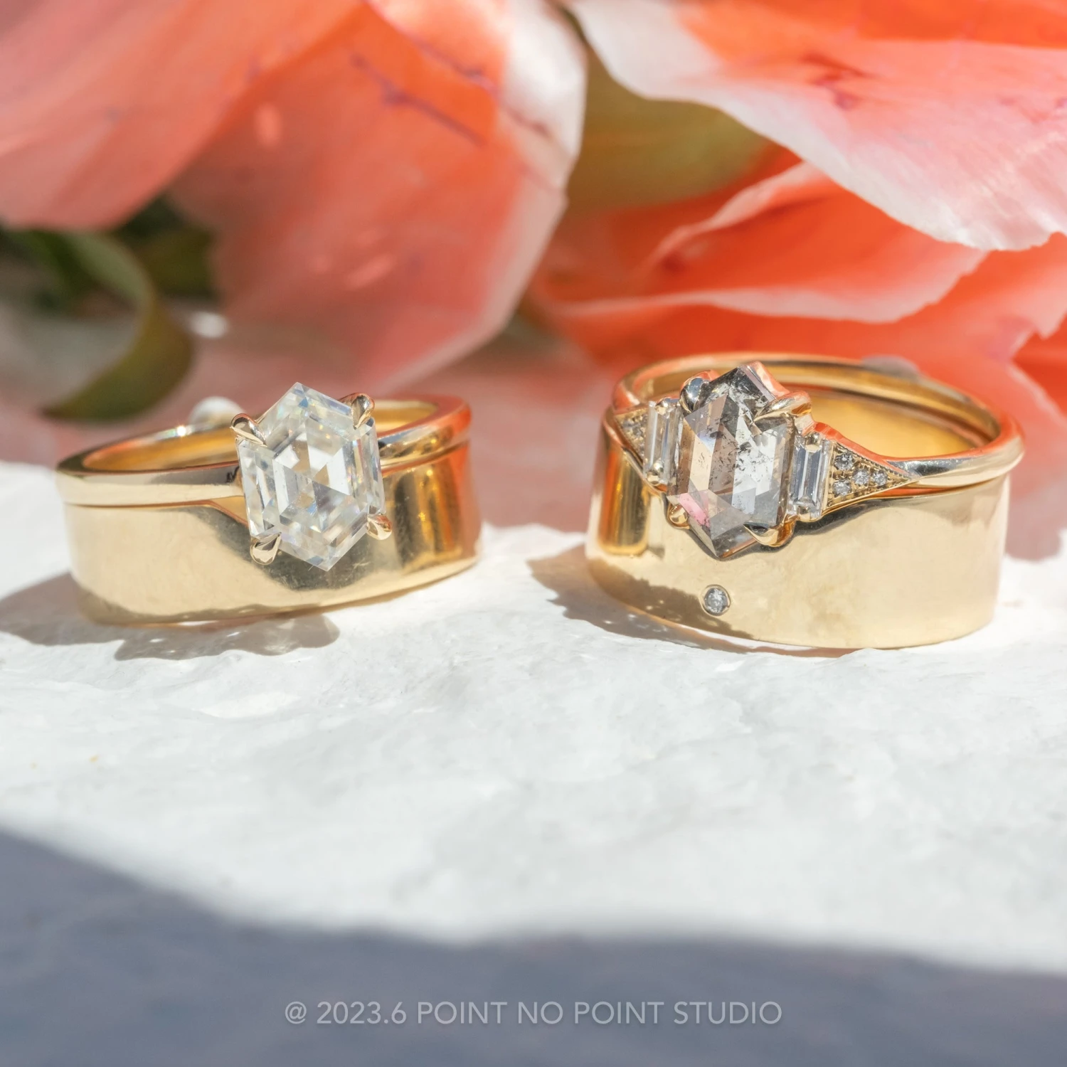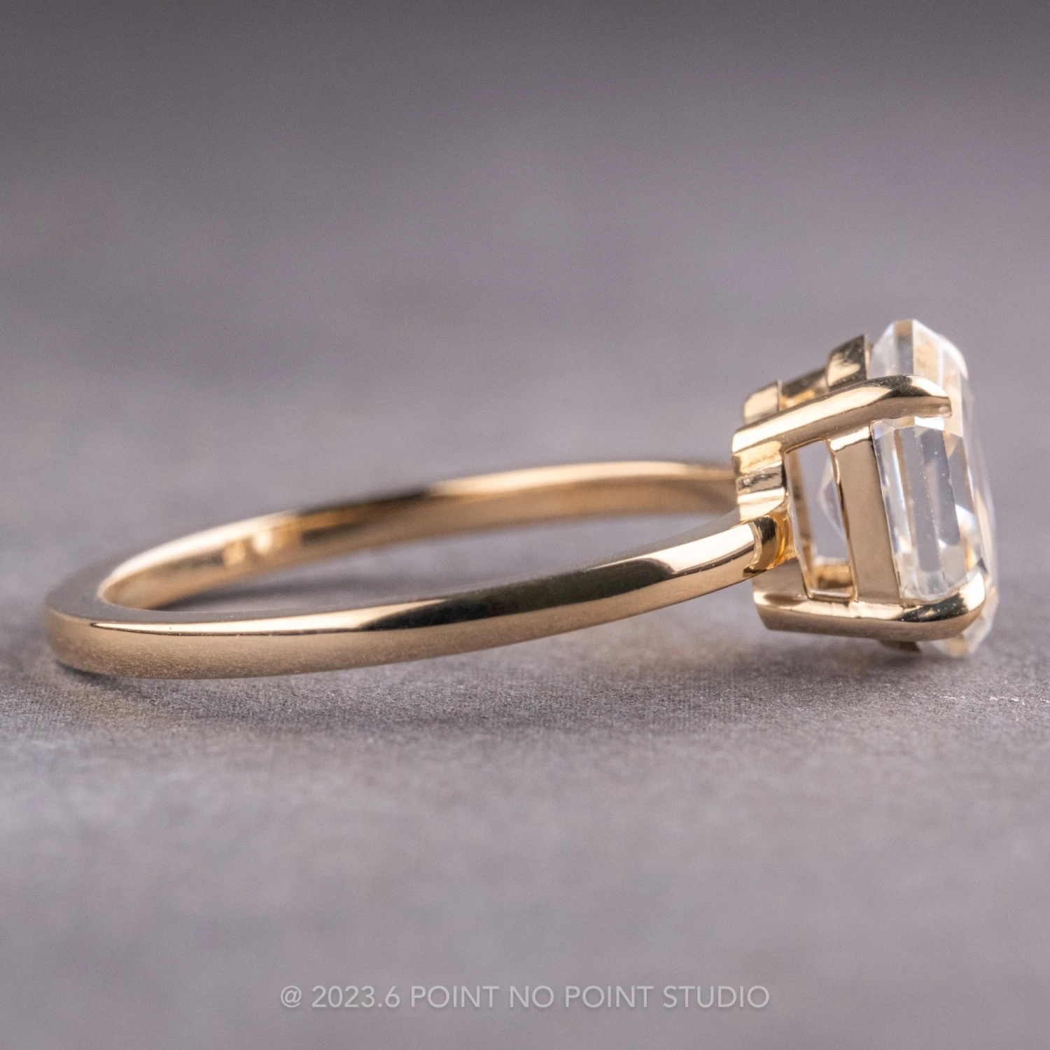 This timeless engagement ring features a stunning hexagon moissanite. The moissanite has been set in a raised profile 4 prong setting. The entire ring is made of recycled 14K yellow gold.