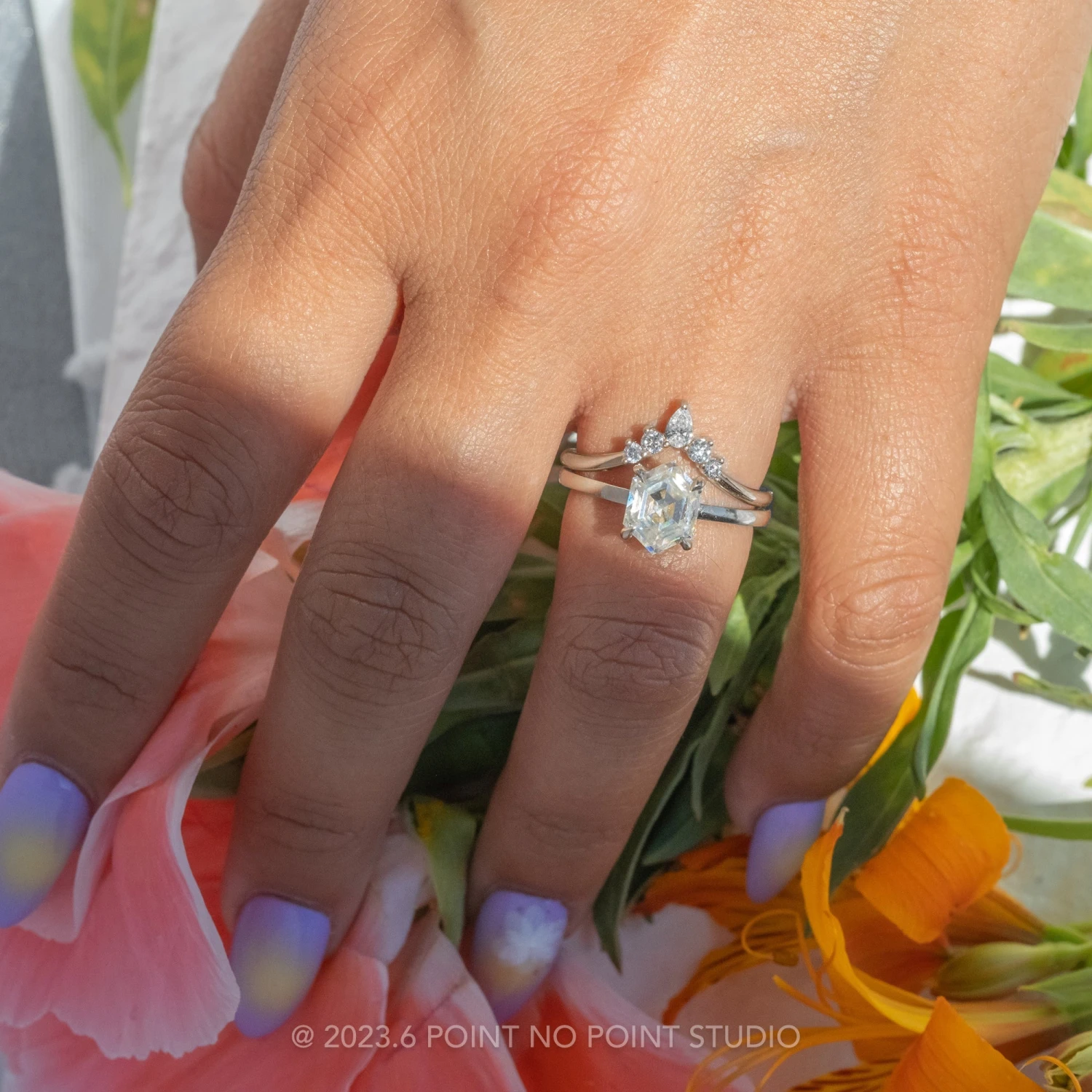 This timeless engagement ring features a stunning hexagon moissanite. The moissanite has been set in a raised profile 4 prong setting. The entire ring is made of recycled platinum.
