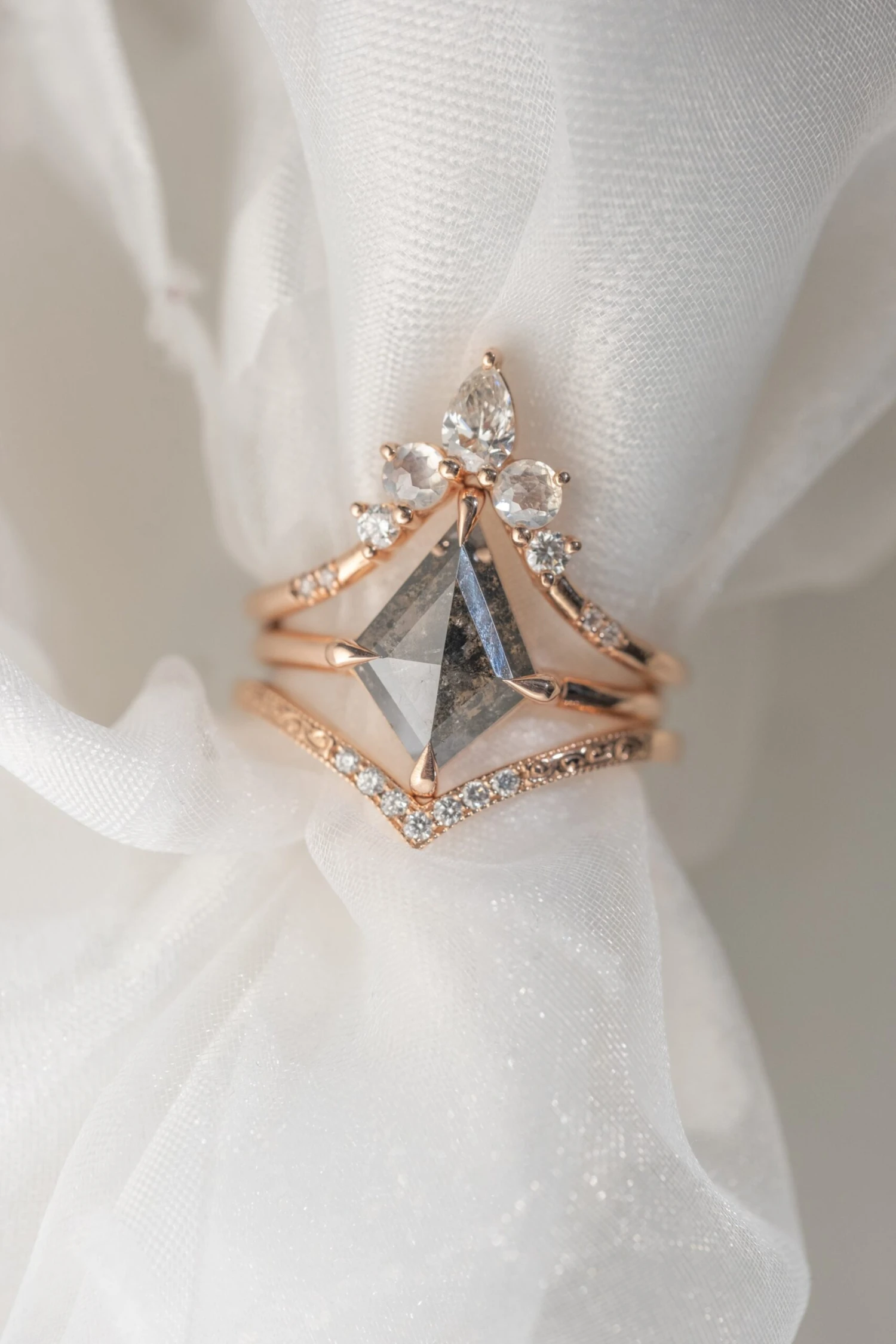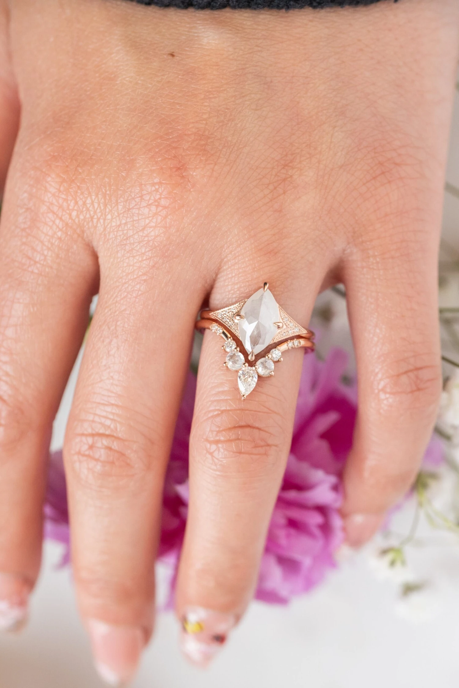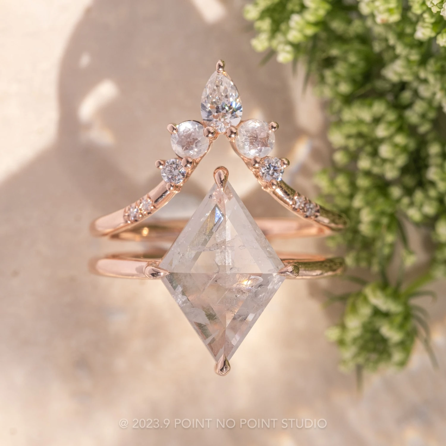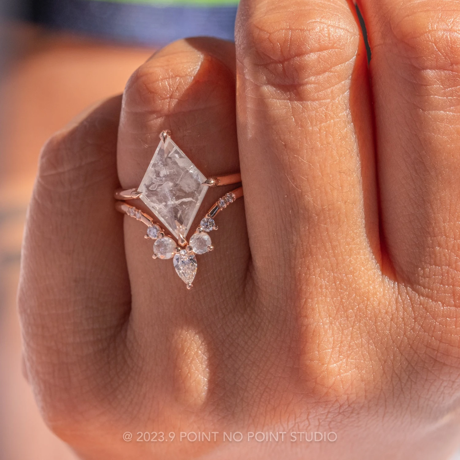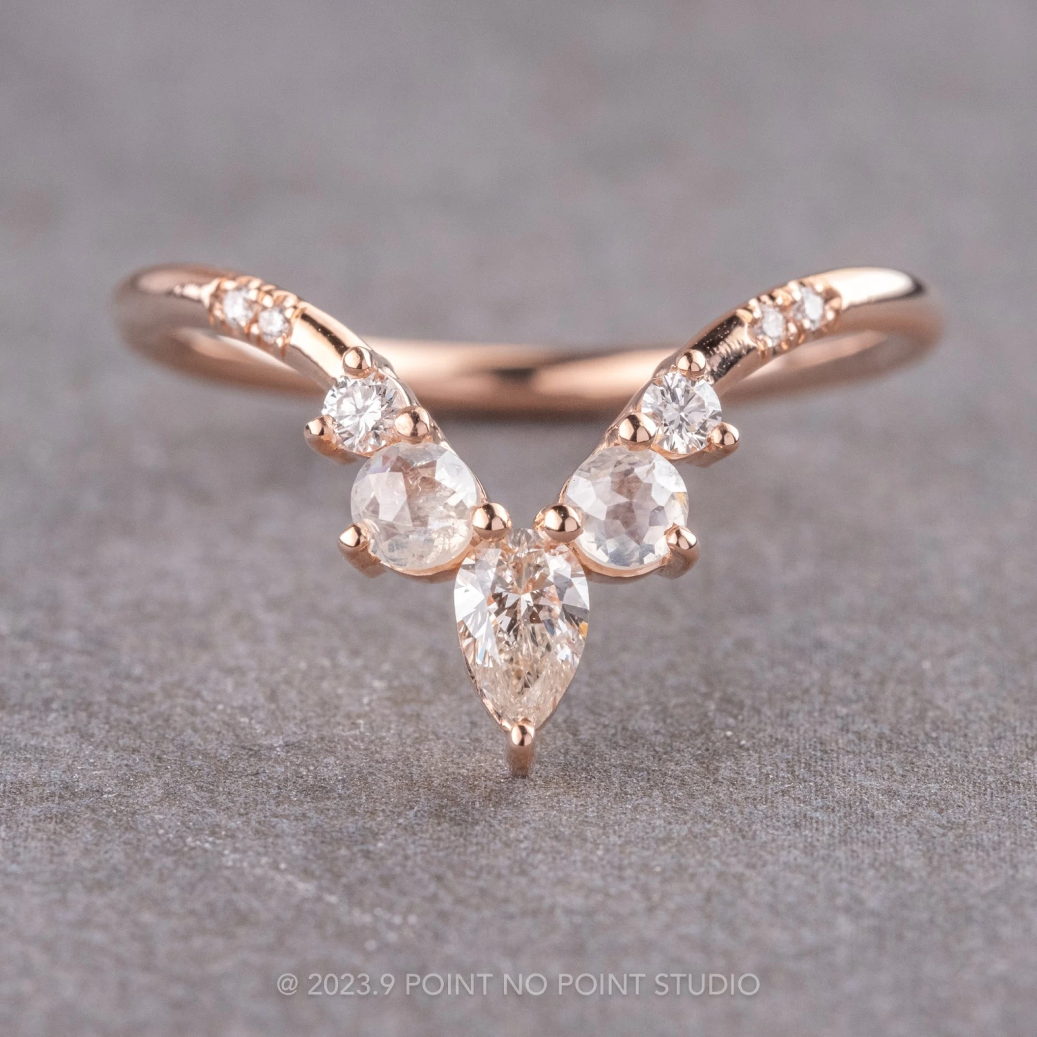 Sitting at the center of this v-contour band is a stunning GHSI white pear diamond, followed by icy white rose cut round diamonds and GHSI faceted white diamonds. This wedding ring is truly a showstopper!