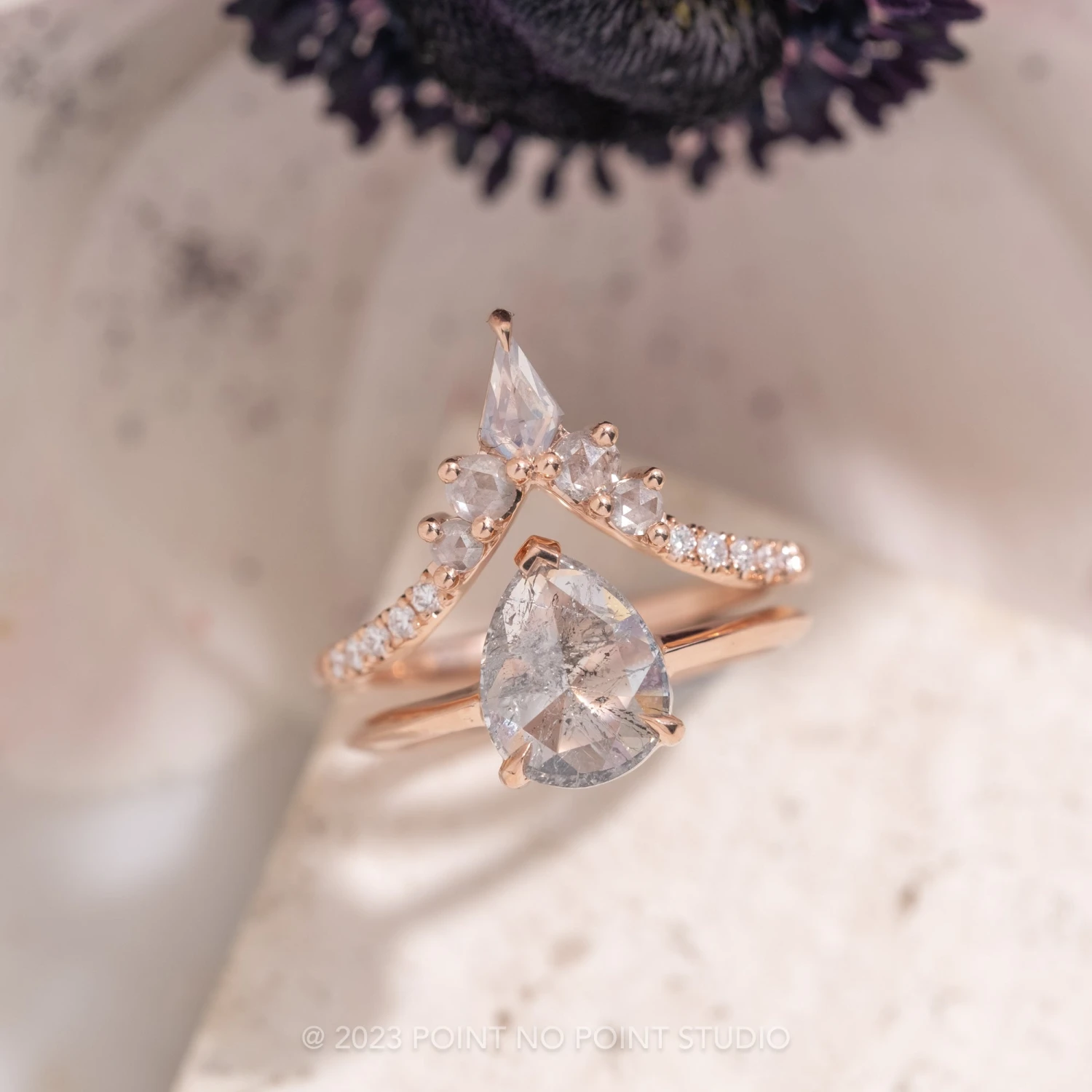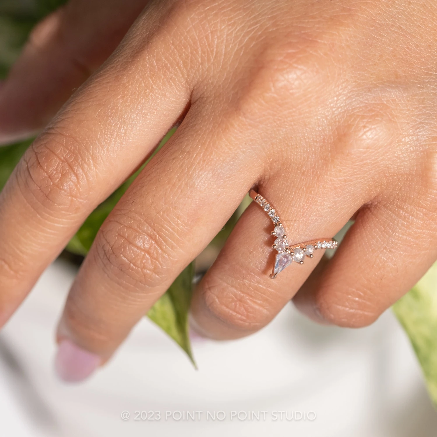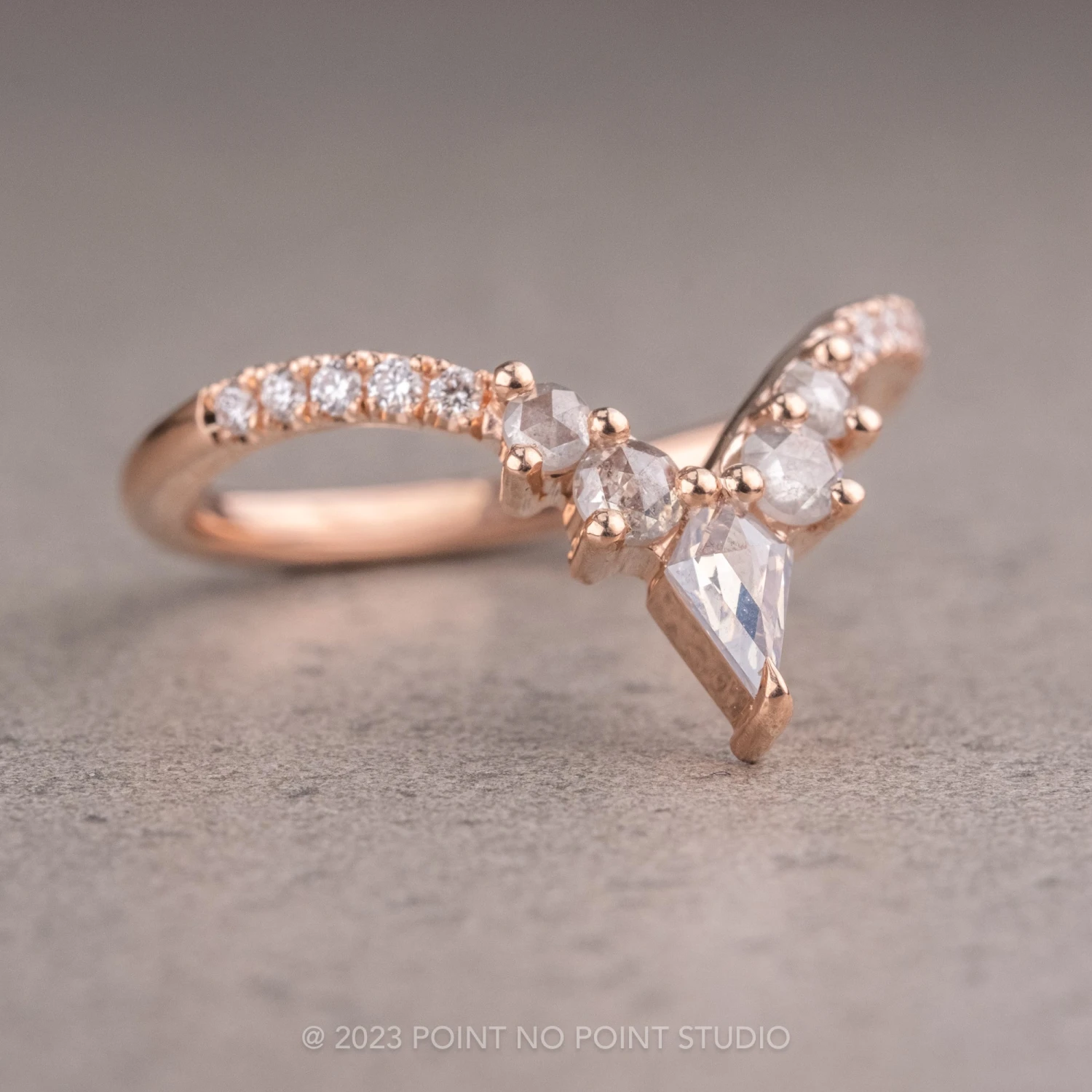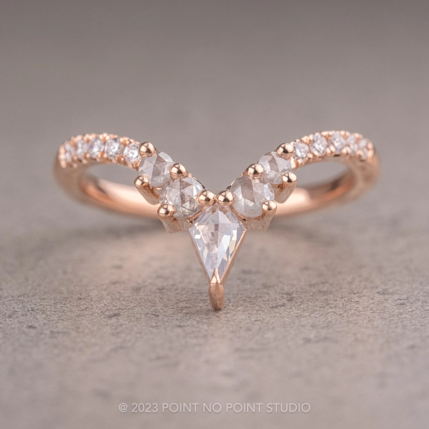 This timeless and unique wedding ring features a striking natural icy white kite diamond at the center of the V. The kite diamond is accented by icy white round rose cut diamonds.