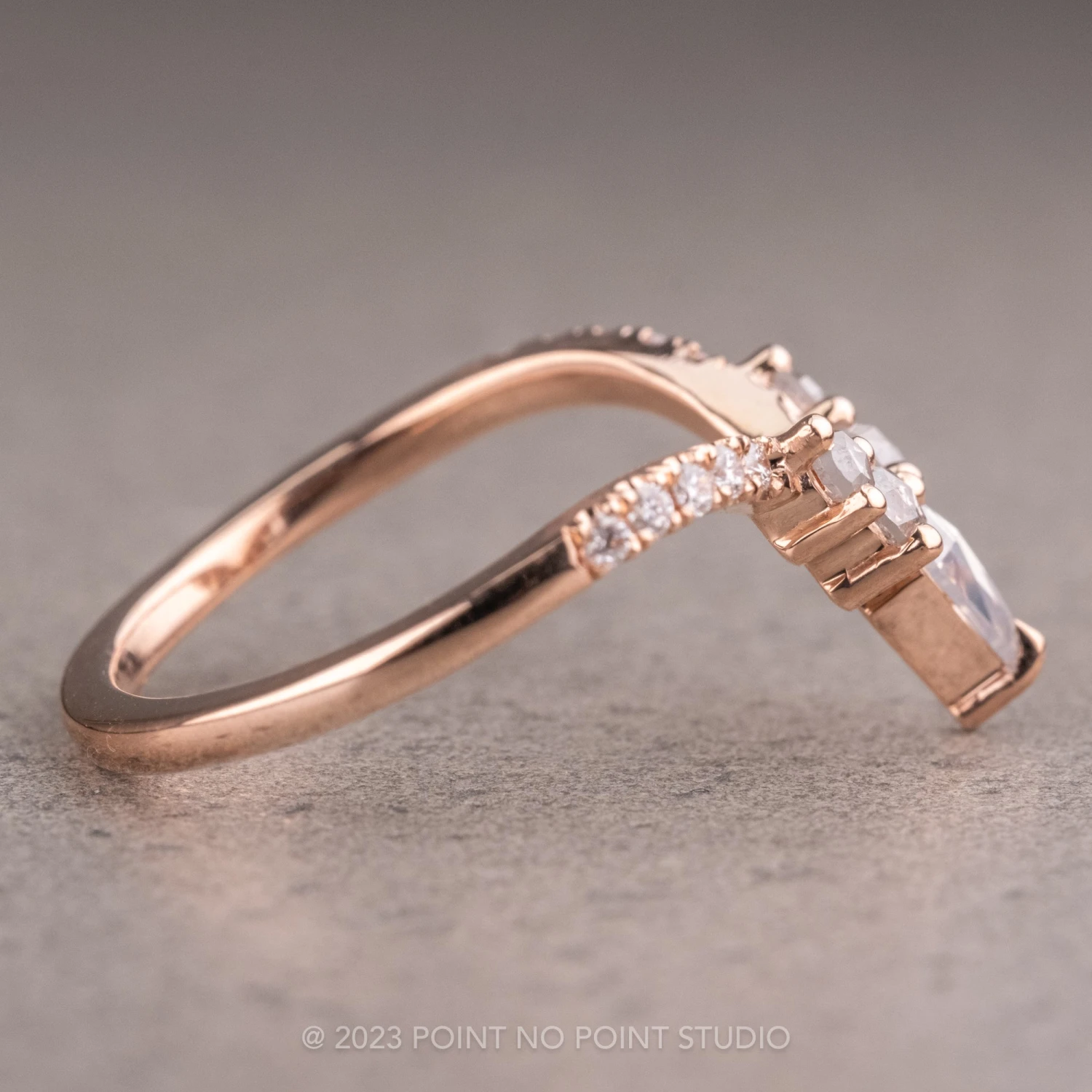 The entire ring is made of recycled 14k rose gold; the top portion of the sloping contour features a polished finish, which highlights the .51 tcw of diamonds beautifully. The band is 1.7mm wide.