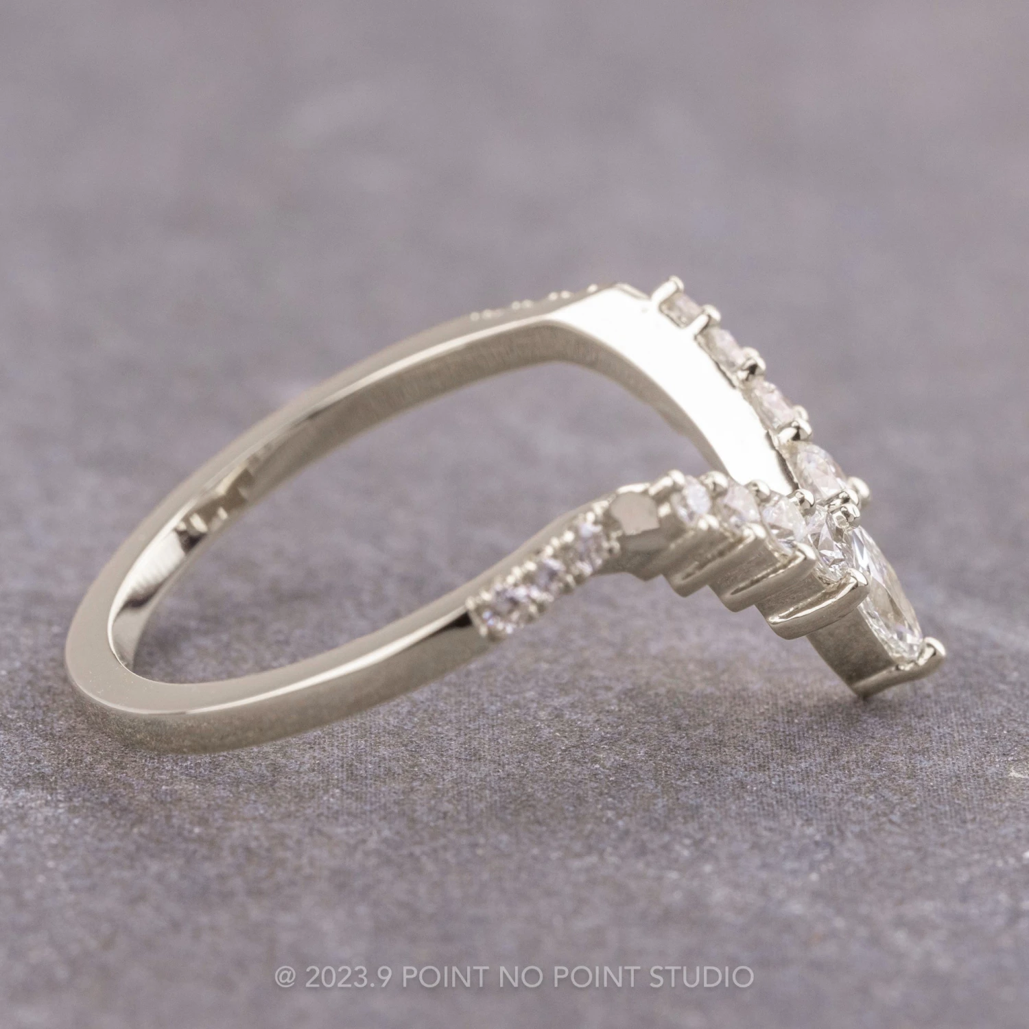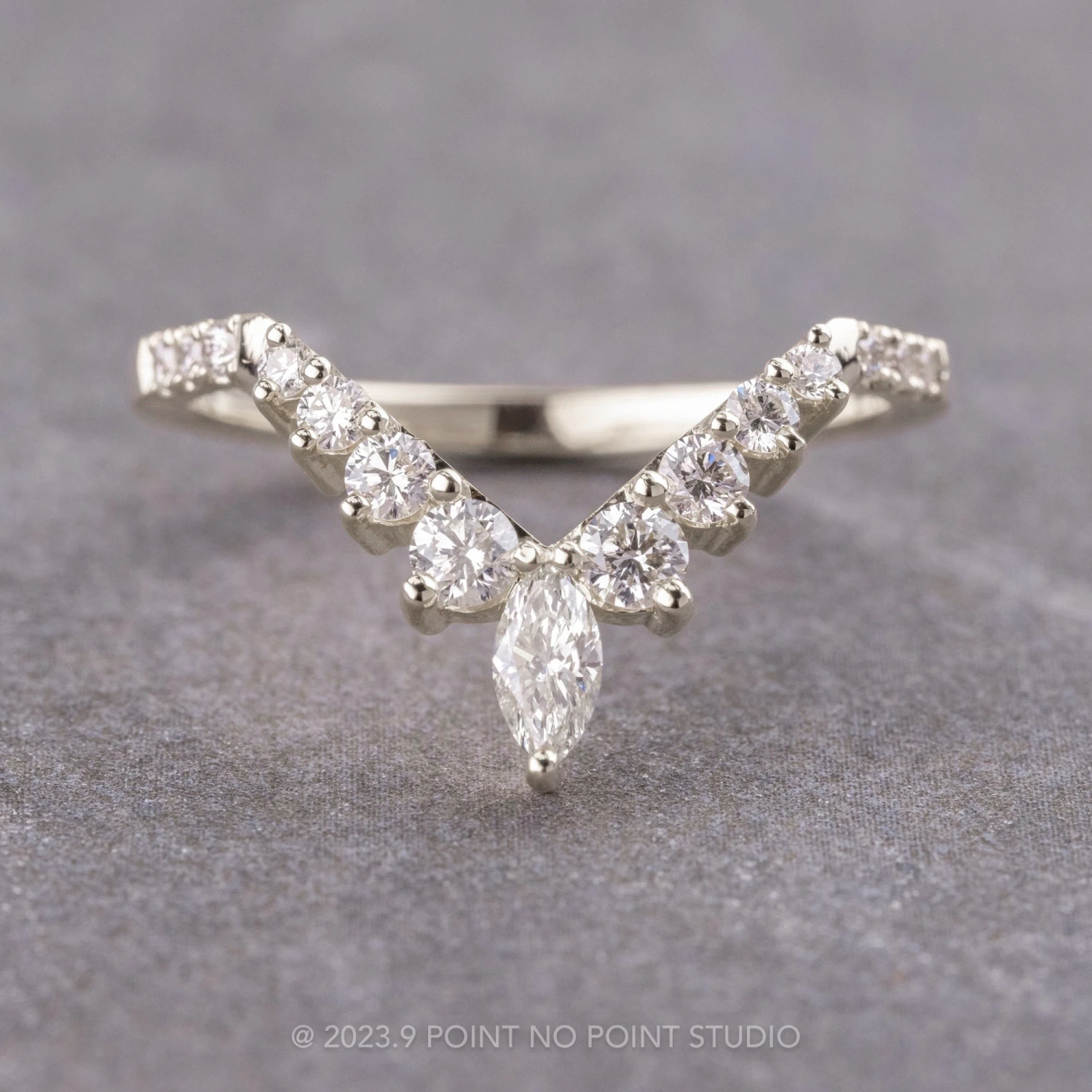 This timeless and unique wedding band features striking GHSI white diamonds in various shapes with a stunning marquise diamond as the focal point. This ring has a v-shape that will complement many different engagement ring styles!