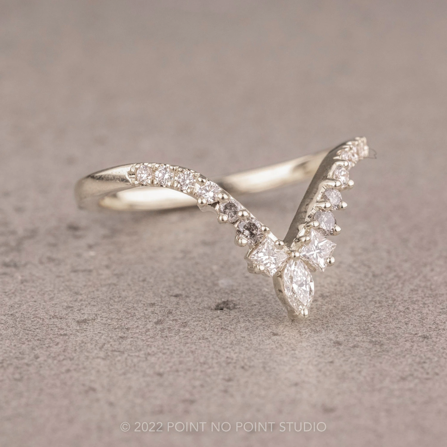 This timeless and unique wedding band features grey and white diamonds in various shapes with a stunning marquise diamond as the focal point. This ring has a v-shape that will complement many different engagement ring styles!