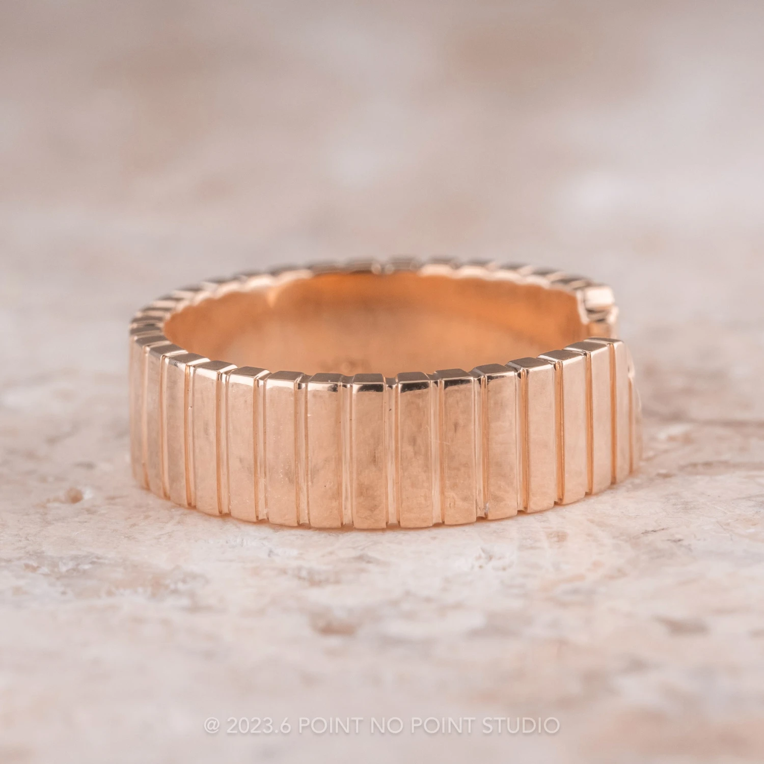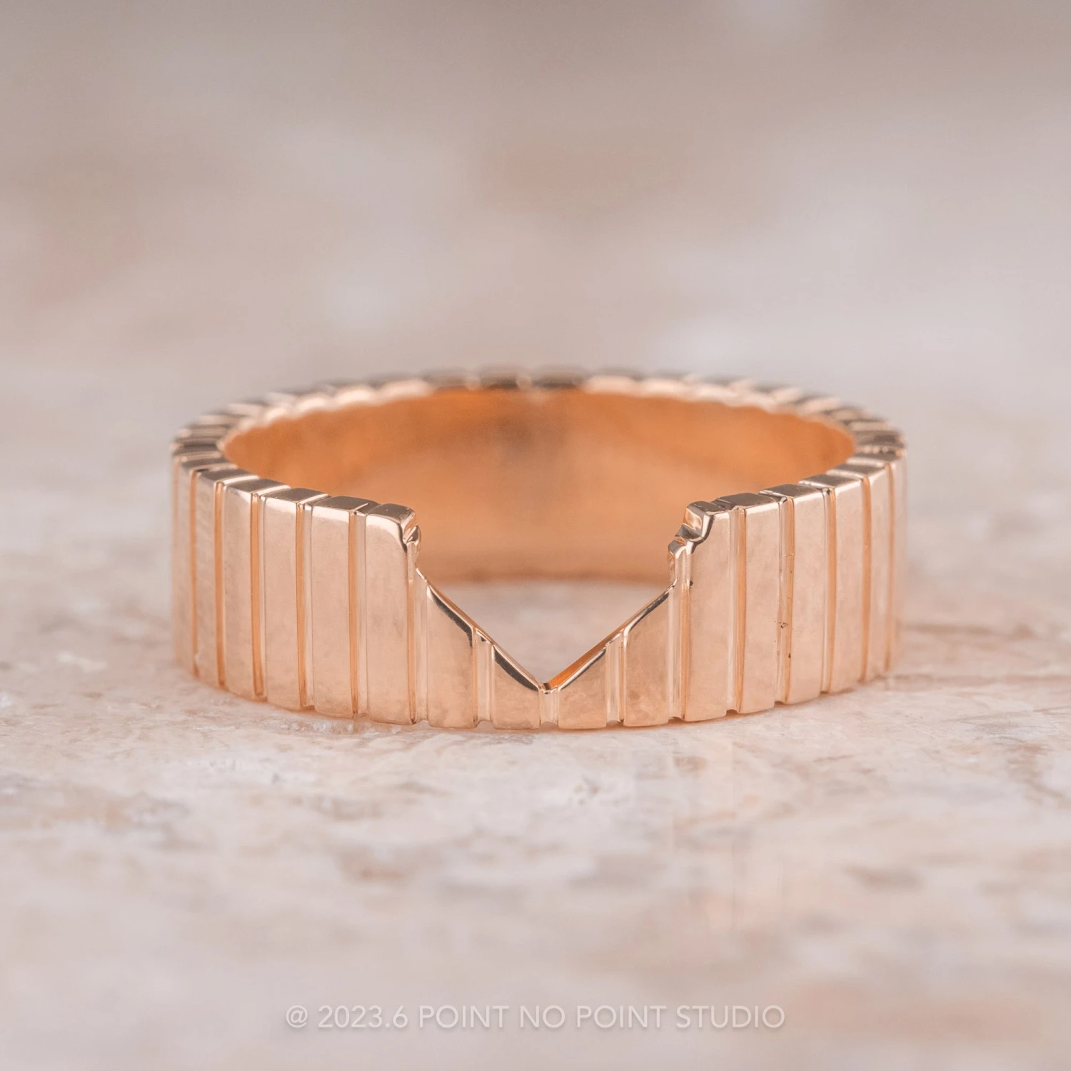 This ring is made of solid recycled eco friendly 14k recycled rose gold. This unique version of our ellipse wedding band has vertical notched cut-outs around the entire ring with a high polished finish.
