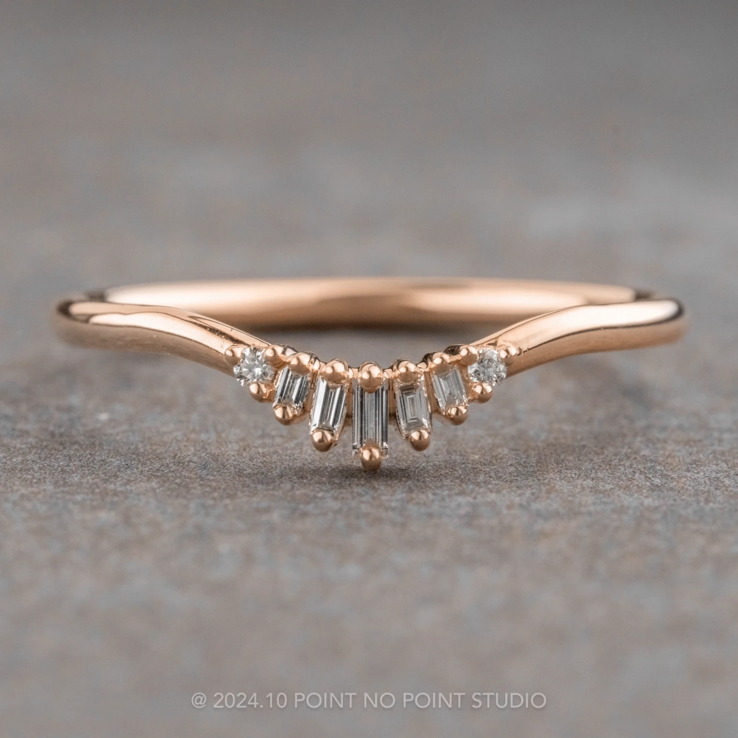 This timeless and unique wedding ring features striking white baguette diamonds accented by natural GHSI brilliant cut diamonds in a softly contouring style that will complement many different engagement ring styles!