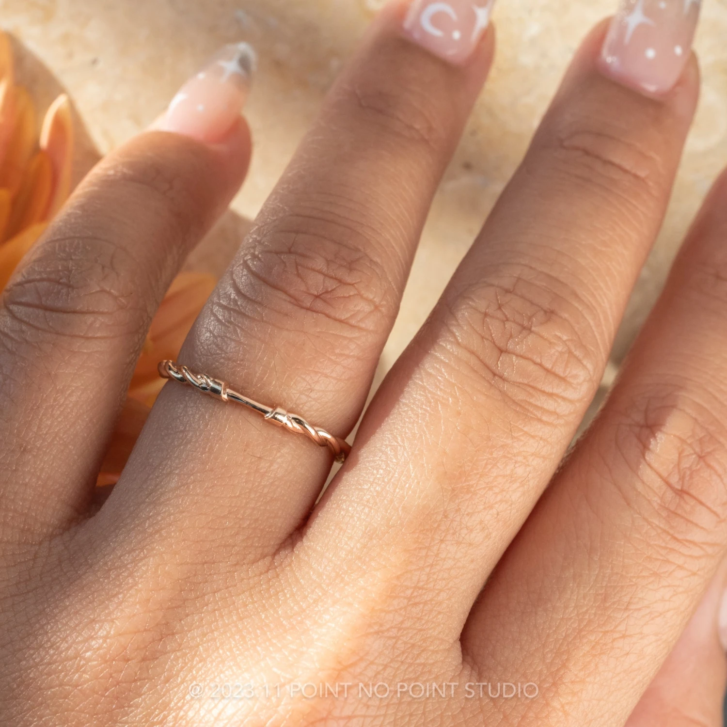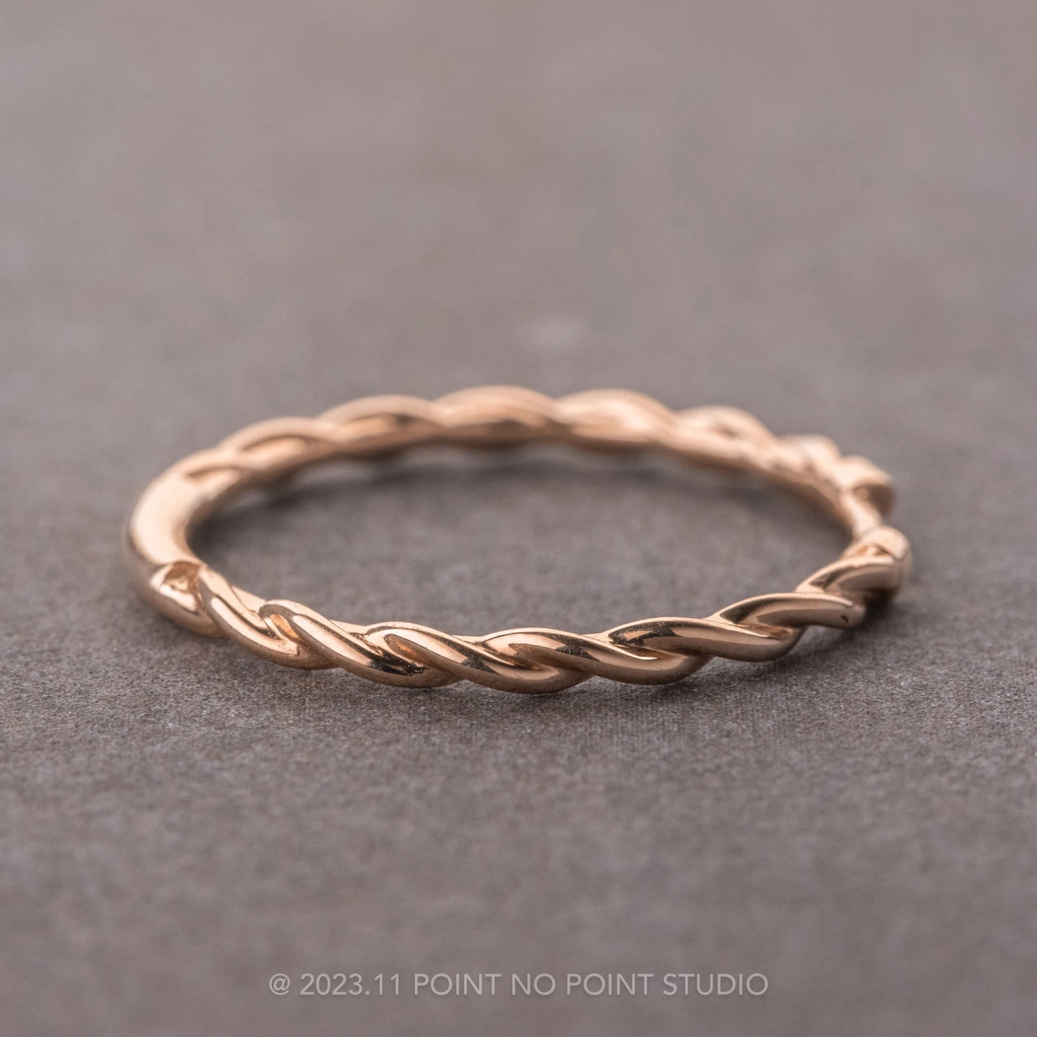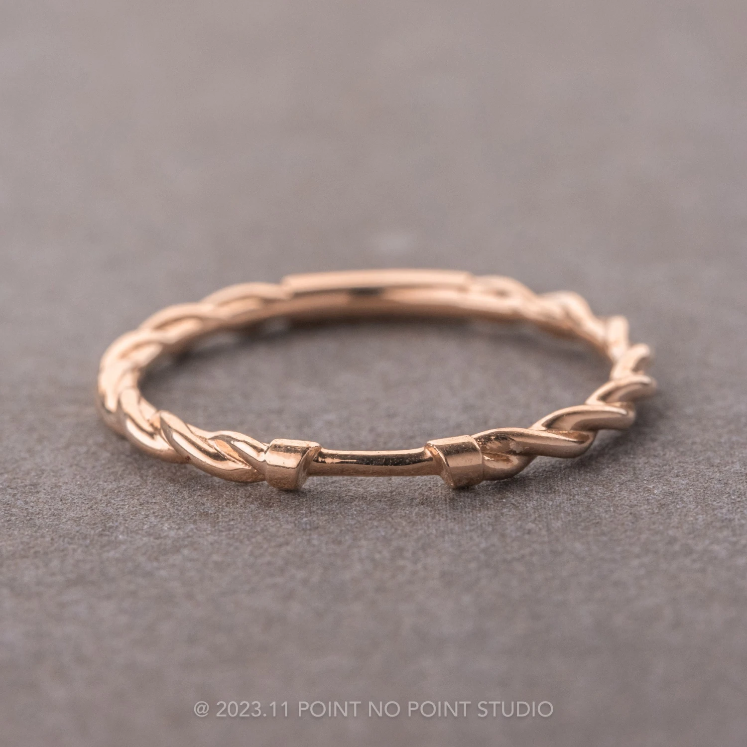 The unique ring features a versatile open cuff design that will complement almost any engagement ring! The cuff design was made with low-profile engagement rings in mind – the cuff satisfies the look of a straight across wedding ring that typically is not able to slide under a low-profile setting. The cuff features a woven rope design and the entire ring is made of eco-friendly recycled 14k rose gold.