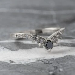 The ring features stunning hand engraved leaf designs on the shank of the ring. Scattered around the ring are sparkly GHSI white diamonds adding that extra sparkle. This v-shaped wedding band can be worn alone, stacked in multiples, or to match any number of our PNPS engagement rings!
