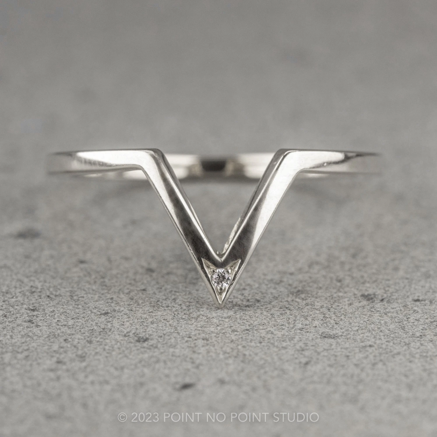 Set into the tip of the band is a .01 carat white diamond. The 14k White Gold band measures 1.7mm and curves elegantly into a contoured V.