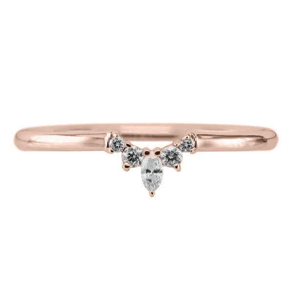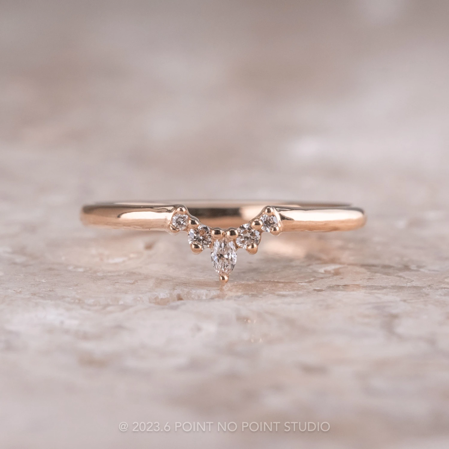 This unique ring features a contoured row of white GHSI faceted brilliant cut diamonds – the focal point being a marquise shaped diamond. The different diamond shapes create a truly unique profile and design that will set off just about any engagement ring.
