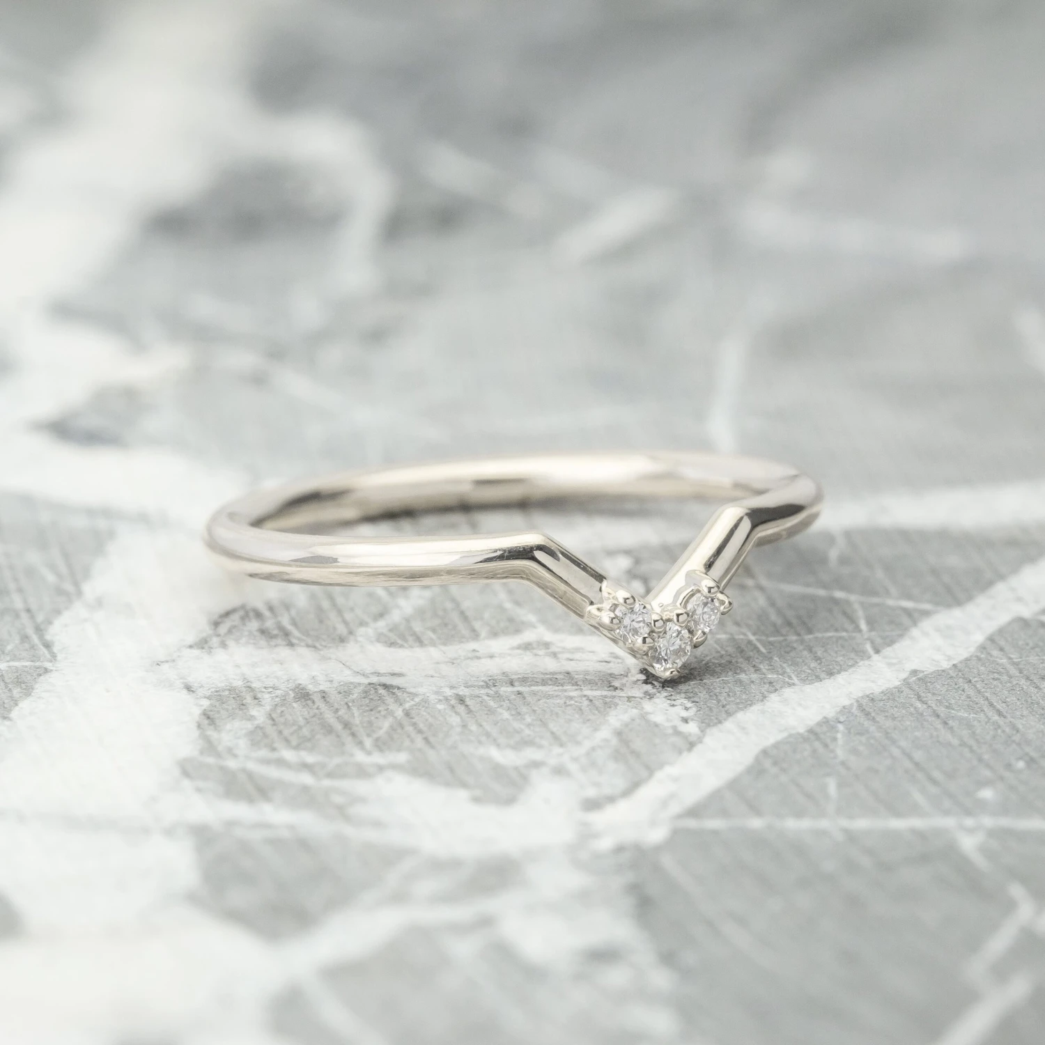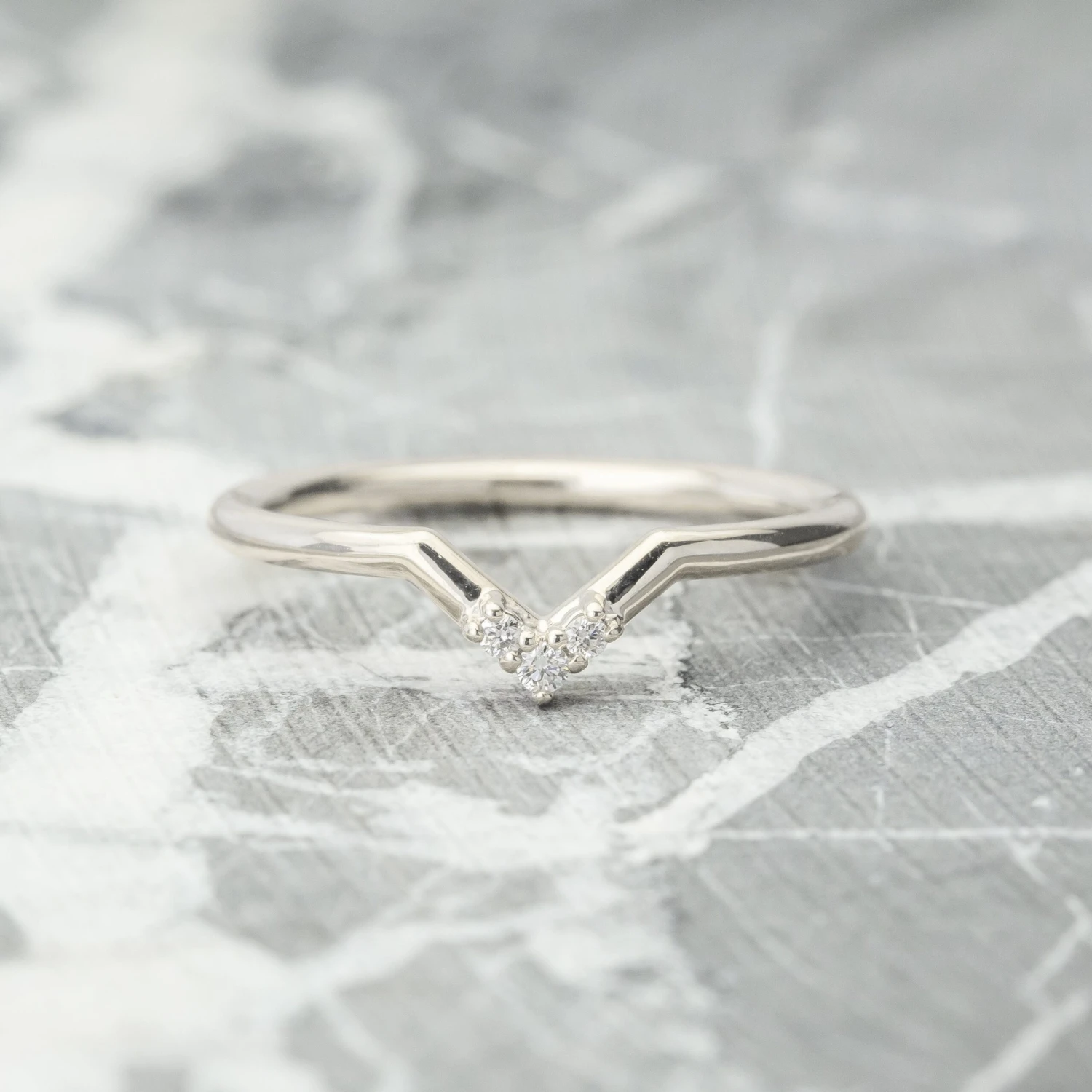 A simple hand crafted V shaped wedding band to be worn alone, stacked in multiples, or to match any number of engagement rings! The band measures 1.7mm and curves elegantly into a contoured V with 3 diamonds prong set onto the V tip.