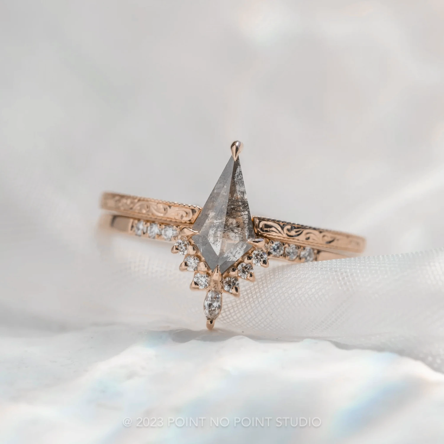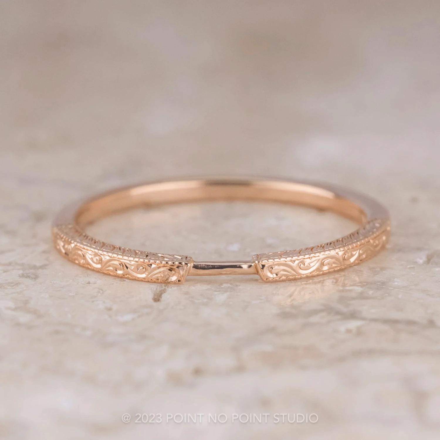 An elegantly enhanced version of our classic Harper cuff with hand engraved ornate detailing features a versatile open cuff design that will complement almost any engagement ring! The cuff design was made with low-profile engagement rings in mind – the cuff satisfies the look of a straight across wedding ring that typically is not able to slide under a low-profile setting.