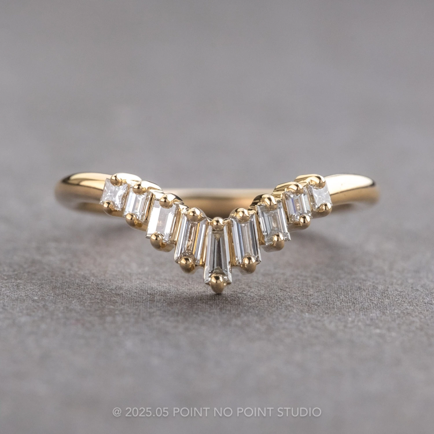 This timeless and unique wedding ring features striking natural white baguette and princess cut diamonds in a softly contouring style that will complement many different engagement ring styles!