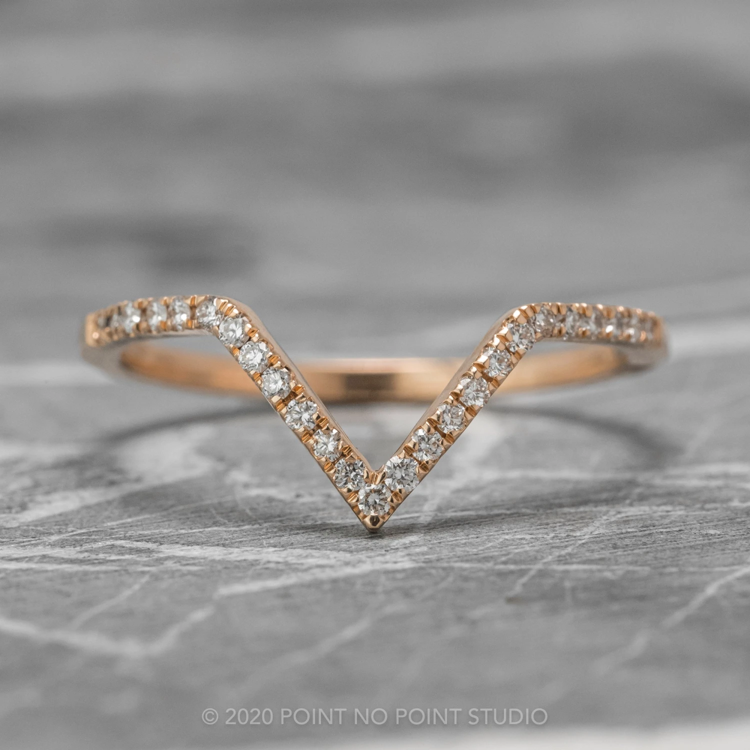 Enhance your engagement ring with the beautiful 14k rose gold chevron wedding band. The versatile profile matches up with many different ring styles. Pictures include a few different options of contouring styles.
